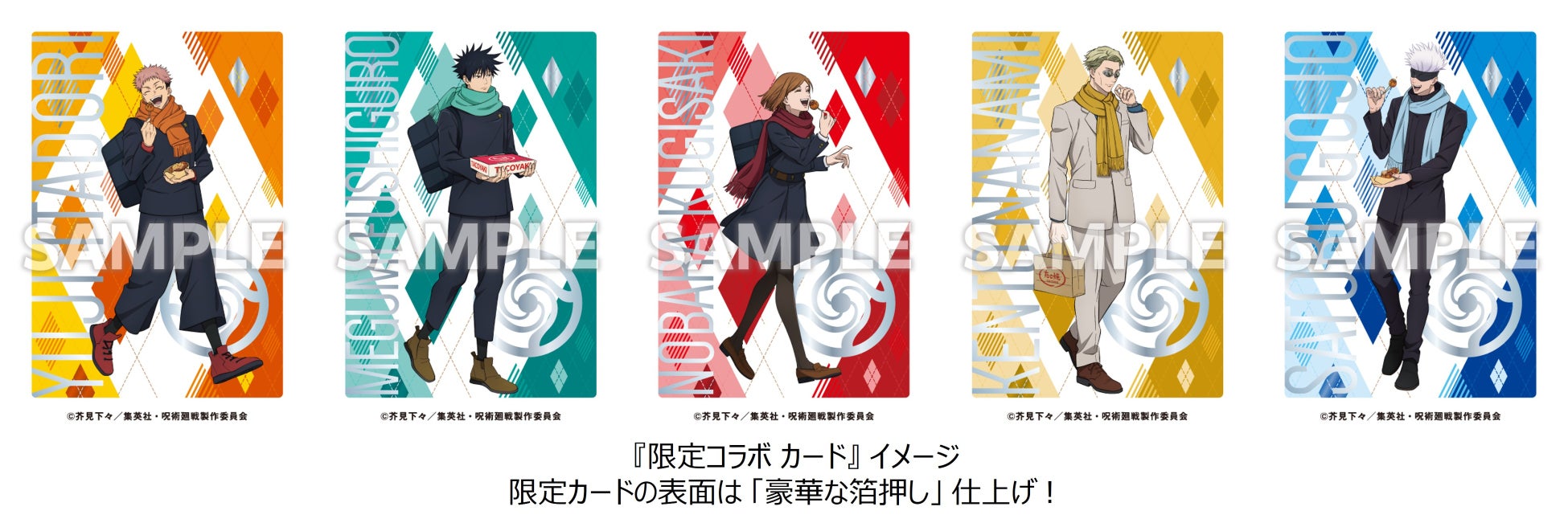 「渋谷事変」 コラボたこ焼購入でもらえる 『限定コラボカード』 は、各弾10種類、合計30種類!今回のコラボ限定描き下ろしキャラクターやアニメの名場面などがデザインされた特製カードをプレゼント!全てのカードの表面は 「豪華な箔押し」 仕上げ!