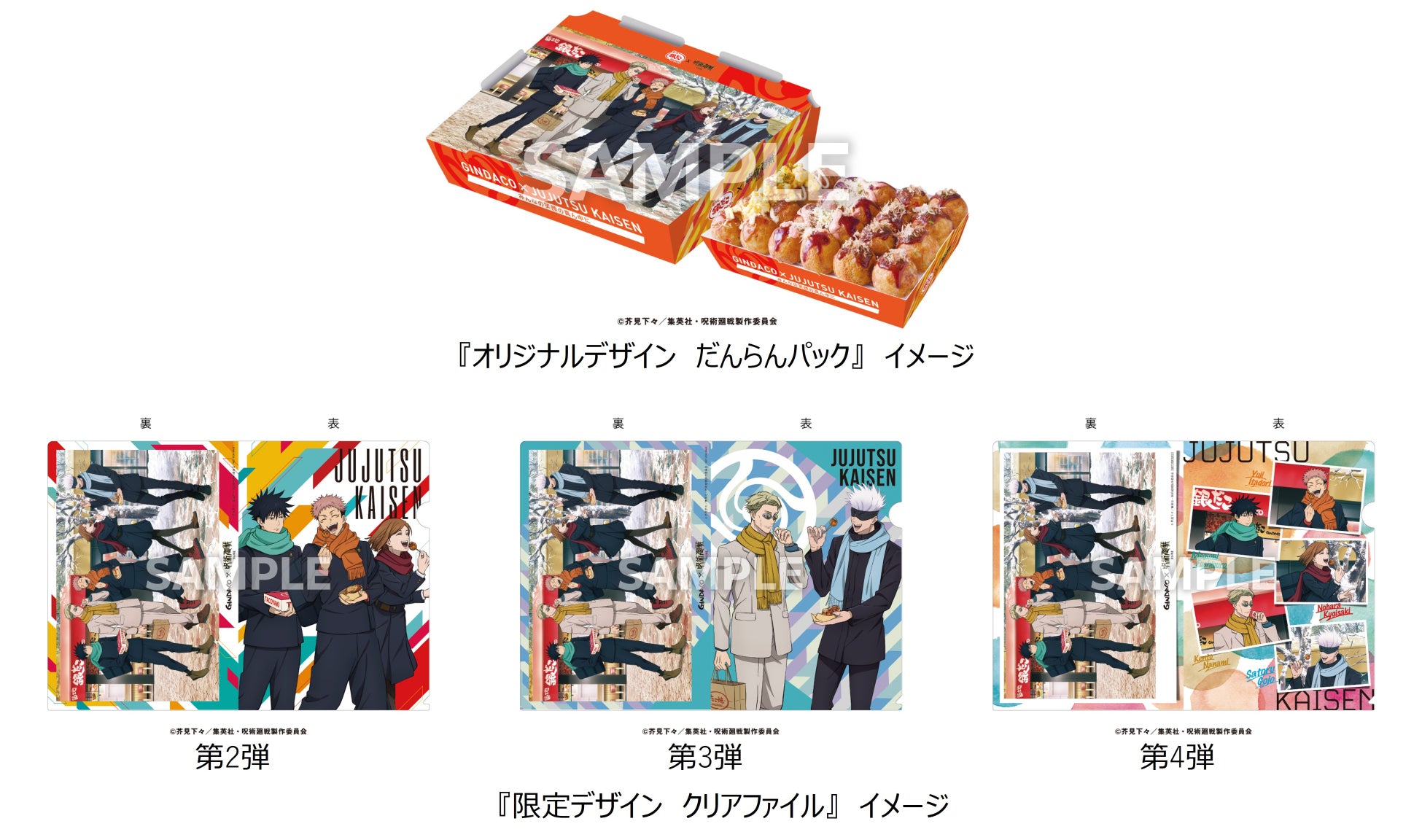 「渋谷事変」 コラボレーションでは、渋谷事変に登場するキャラクターらをイメージした 『コラボたこ焼(8個入り)、特製スリーブ、限定コラボカード付』 や、オリジナルデザイン 『だんらんパック(24個入り)、限定デザインクリアファイル付』 に加え、オリジナルデザイン 『クロワッサンたい焼BOX(6匹入り)、限定デザイン クリアファイル付』 の販売や、各社宅配サービスでは 『オリジナルデザインBOX入り & 限定デザイン クリアファイル』 を販売いたします。