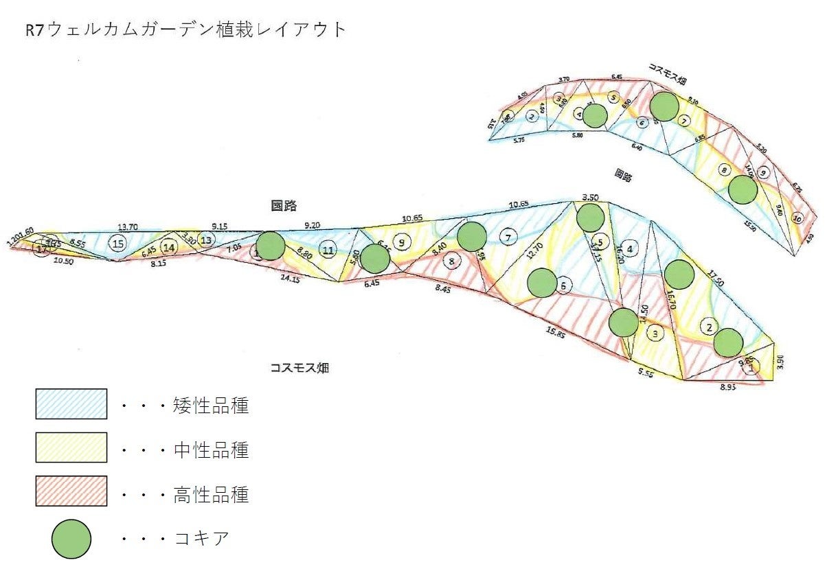 今年のウェルカムガーデンは、ナチュラルガーデンのように多様な品種が入り混じる「ブーケのようなデザイン」をイメージして植栽しています。ガーデン内には背の低い矮性品種、ほどよい高さの中性品種、存在感のある高性品種をバランスよく植えており、立体感のある奥行き豊かな花畑を演出しています。