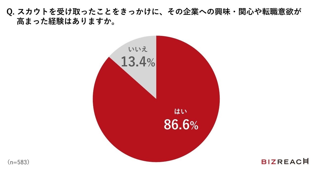 ビズリーチ会員にアンケートをとったところ、スカウトを受け取った経験のあるビジネスパーソンのうち86.6%がスカウトを受け取ったことをきっかけに、その企業への興味・関心や転職意欲が高まった経験があることがわかり、企業が直接送るスカウトが、潜在層に対するアプローチにおいて高い効果があることがうかがえます。