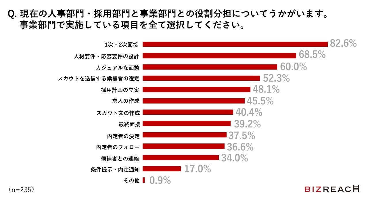事業部門が採用に関わることのメリットとして「選考時のミスマッチが防げること」や「採用したい人材要件が明確になる」などが挙げられ、既に人事部門と事業部門が連携して採用活動を行う企業が多くあります。しかし、現在の人事・採用部門と事業部門との役割分担について質問したところ、事業部門が実施している項目としては「1次・2次面接」「人材要件・応募要件の設計」など選考に関する内容が高い結果となり、「スカウトを送信する候補者の選定」は52.3%、「スカウト文の作成」は40.4%にとどまりました。また、事業部門が中途採用業務に関わるなかでの課題は、「採用業務を行う時間をとりにくい」が59.2%と最も高い結果となりました。 即戦力人材の採用難度が高まるなか、選考に入る前段階の採用活動であるスカウト送信候補の選定からスカウト文作成、カジュアルな面談までを事業部門が担当することで求める人材の採用成功につながるため、今後事業部門がより採用にコミットできる採用体制が求められます。