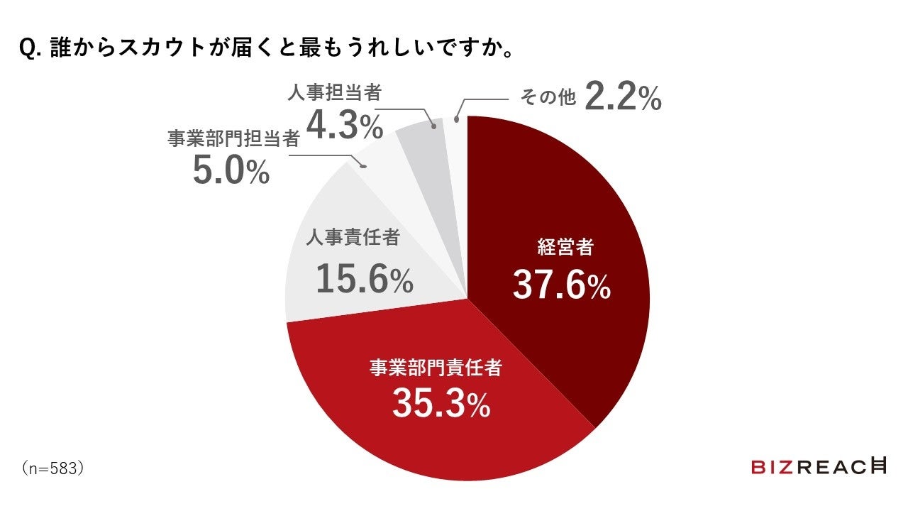 また、スカウトの送信者に関するアンケートでは、特に「経営者」「事業部門責任者」から届くと魅力的に感じるビジネスパーソンが多い傾向がありました。