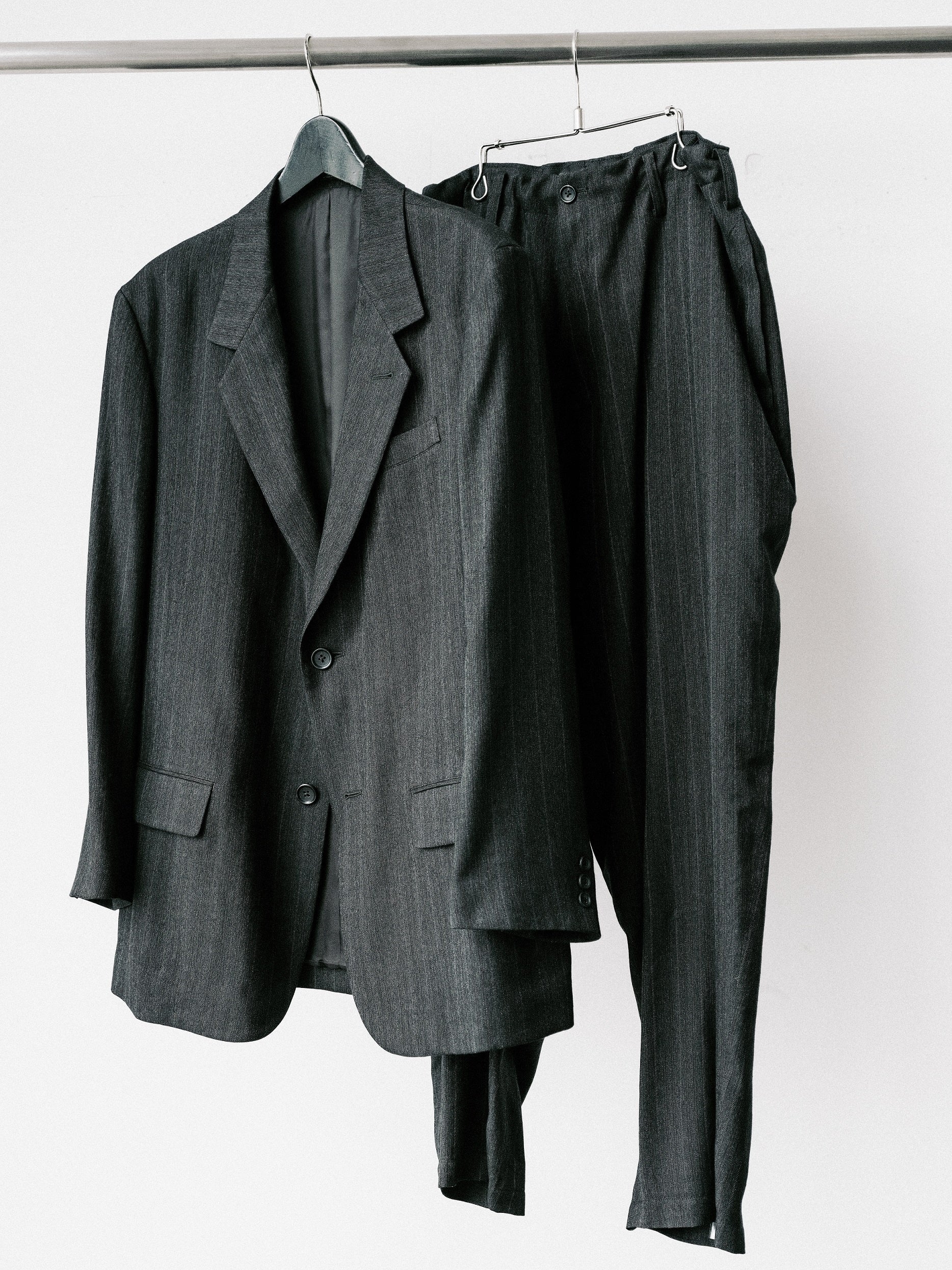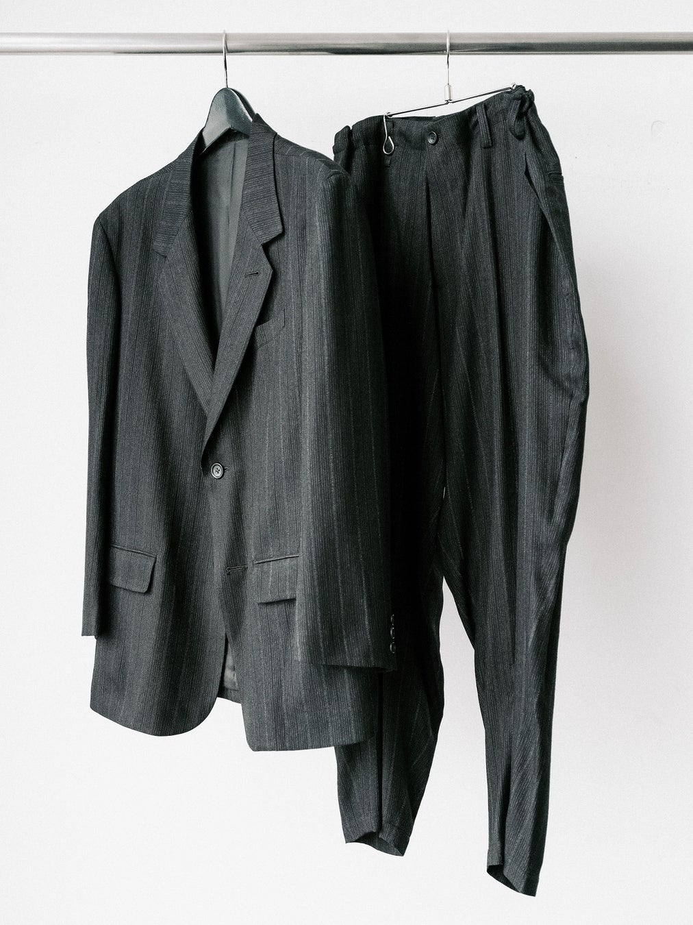 クラシックな2種類の杢ストライプ柄のセットアップは、レーヨン素材を使用することで柔らかく滑らかな着心地となっています。シンプルな2ツ釦のジャケットに、脇タックのウエスト紐パンツのセットアップは、Y’s for menが新たに提案するスーツです。