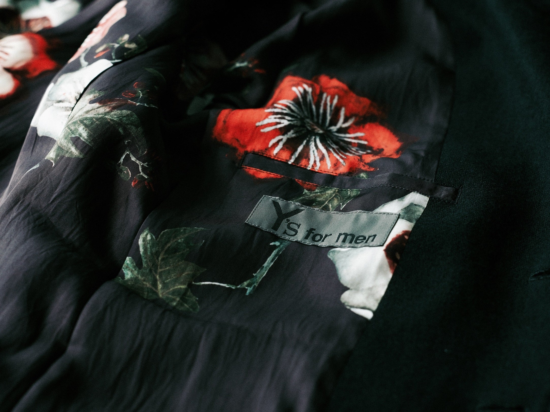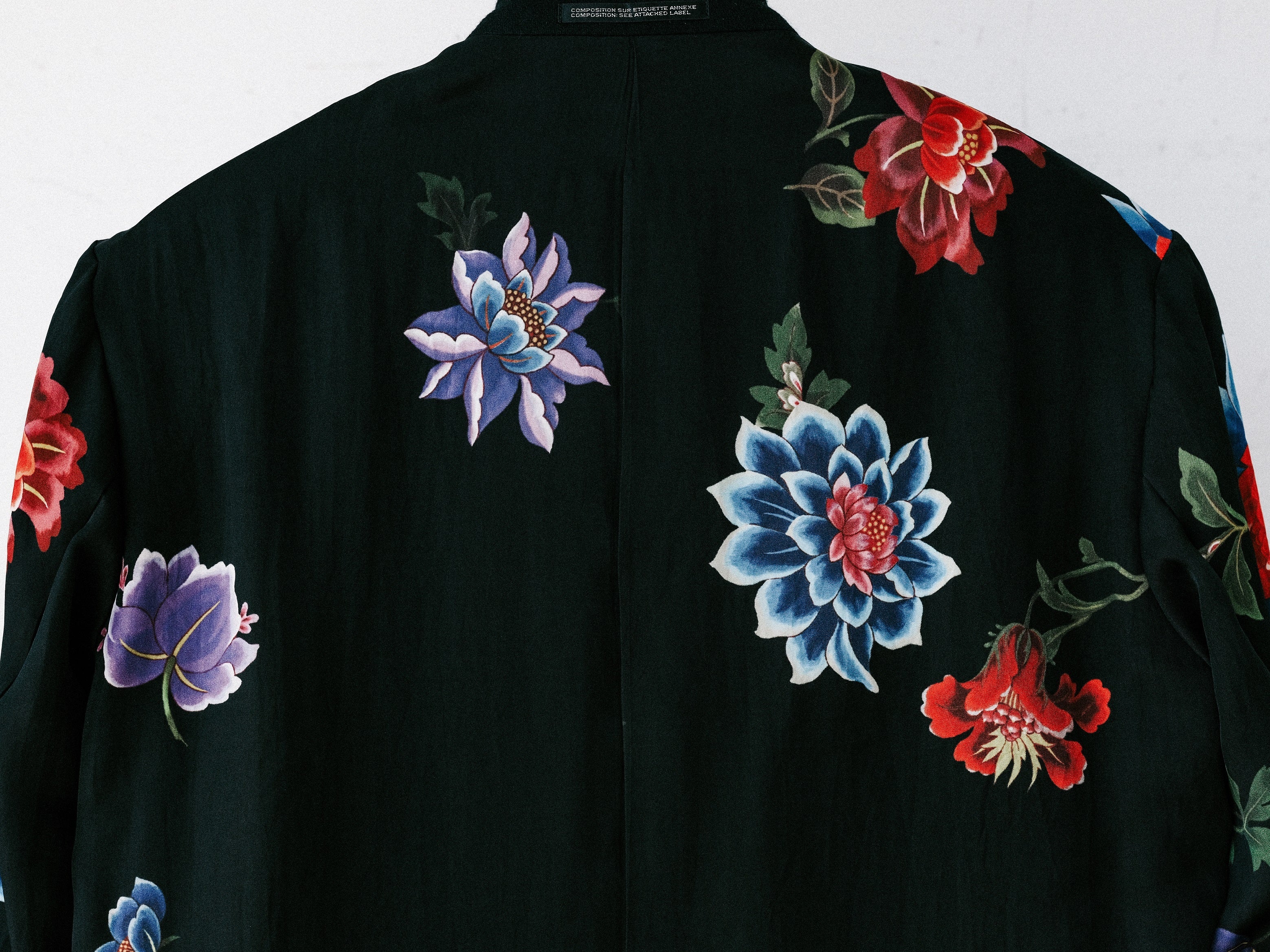 Y’s for menアーカイブより、花柄の図案を新たなデザインとして、高度な技術により色鮮やかにプリントし、柔らかなフラノ素材のブラックスーツの裏地にそれぞれ異なる花柄のプリント生地を取り付けています。