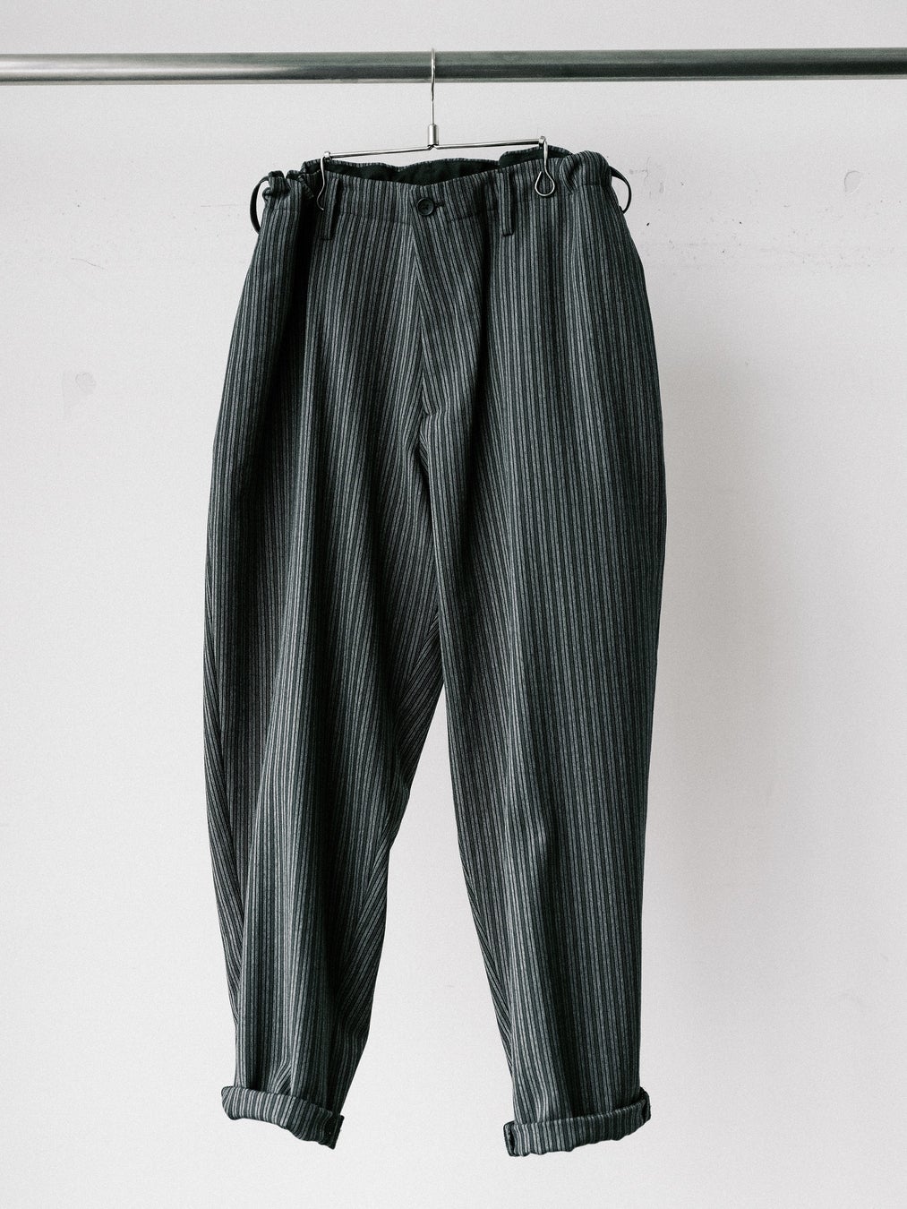 ストライプ柄のコールパンツは、ウール素材とポリエステル素材をバランスよく合わせることで、しなやかさと強いコシ感があり、シワや汚れにも強いリアルクローズなパンツとなっています。ブラックジャケットとの相性も良く、パンツ単品でも使い易いウエスト紐パンツです。