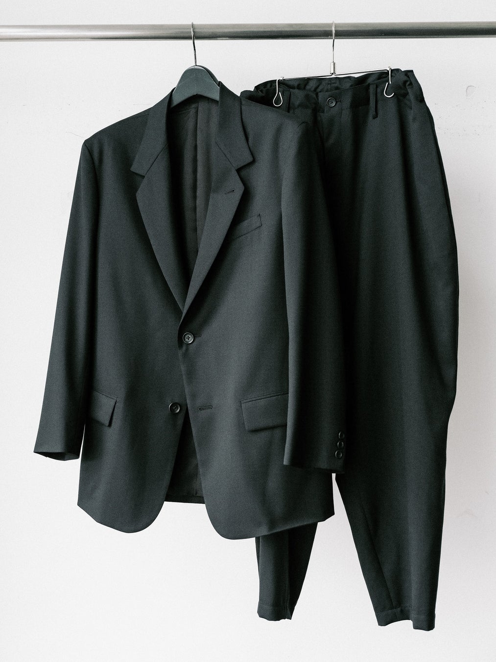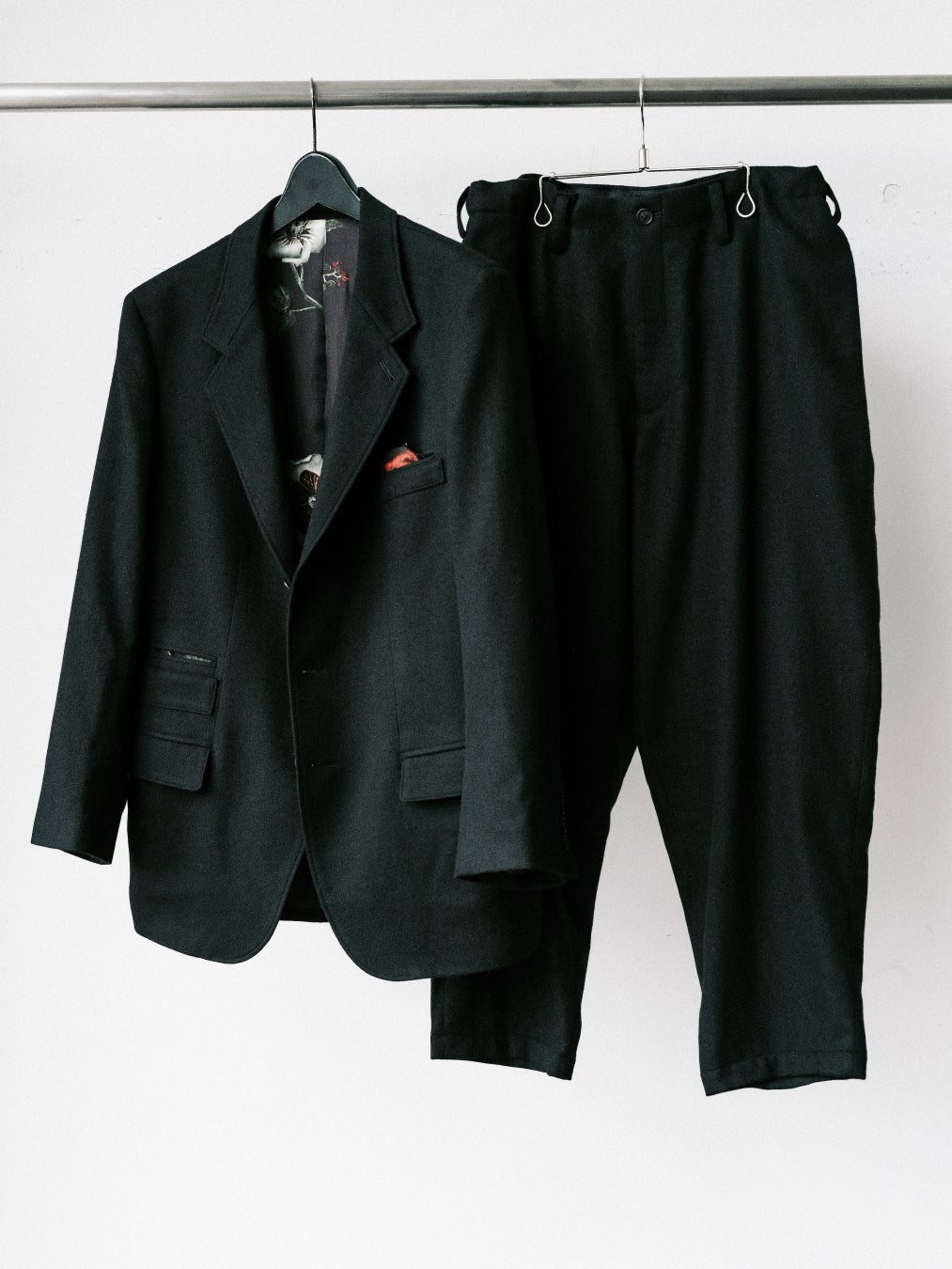 ブラックとグレーのセットアップには、ウール本来の光沢感やしなやかなドレープ性、繊細なクリンプを持つ厳選されたSUPER100’sを使用しています。シンプルな2ッ釦のジャケットに、脇タックのウエスト紐パンツのセットアップは、Y’s for menが新たに提案するスーツです。