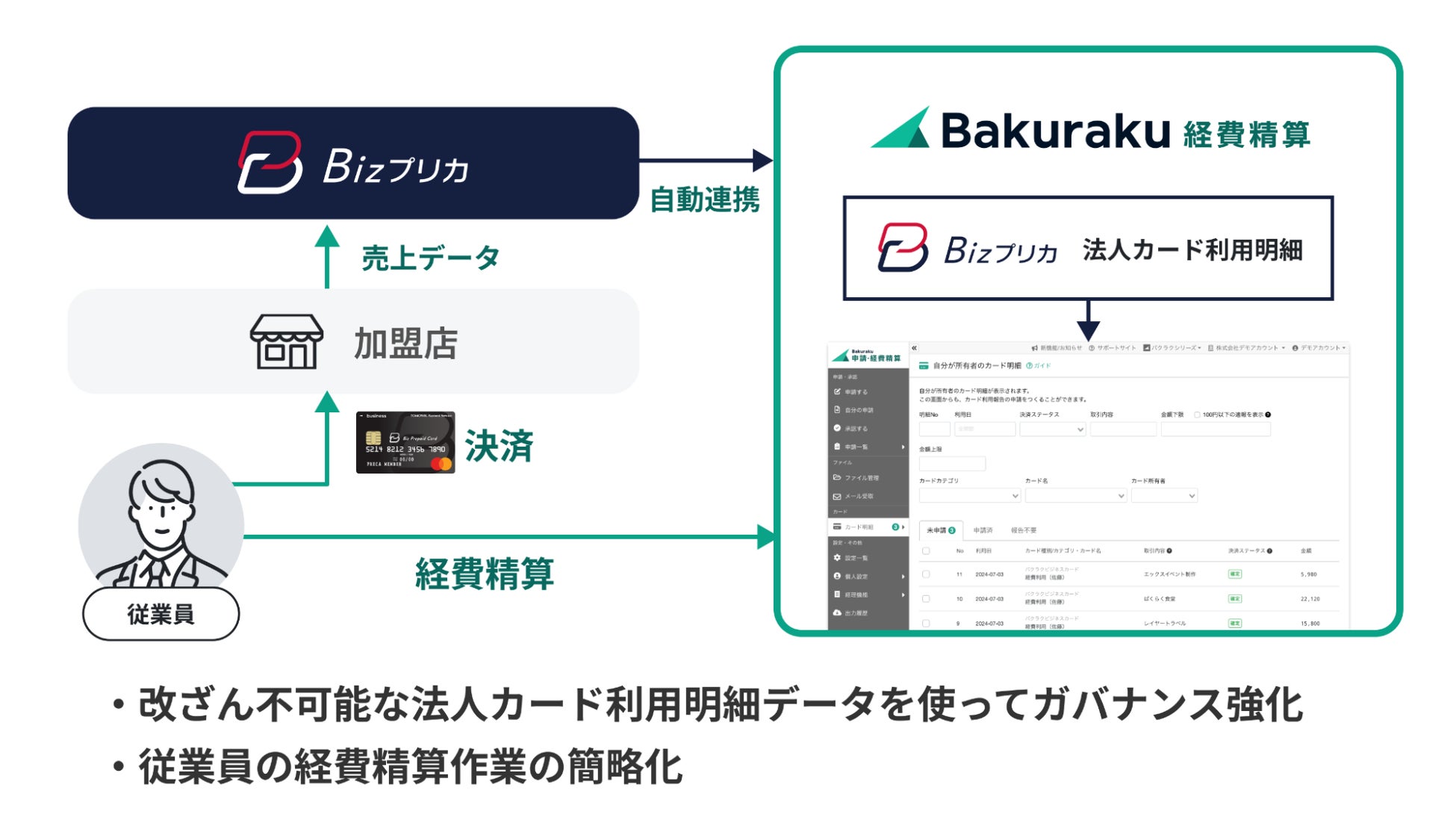 今回の連携により、「Bizプリカ」のカード利用明細データが「バクラク経費精算」へ自動的に取り込まれるようになります。