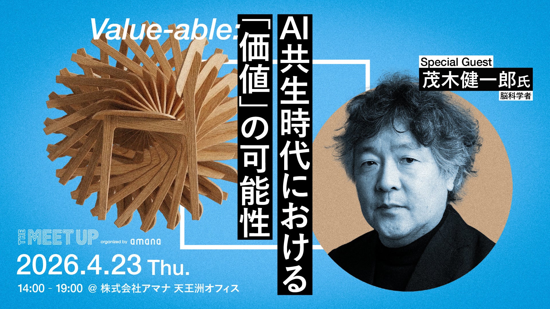 コミュニケーション変革をクリエイティブで実現する株式会社アマナ(本社:東京都品川区、代表取締役社長:金子剛章、以下「アマナ」)は、2026年4月23日(木)、『THE MEET UP|Value-able: AI共生時代における「価値」の可能性』をテーマにリアリイベントを開催します。