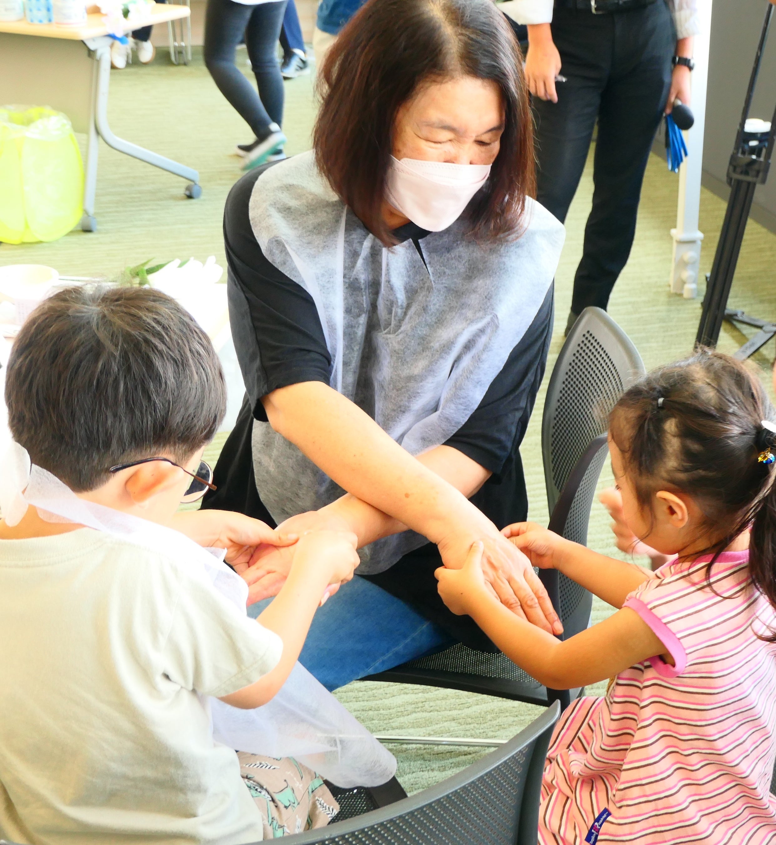 当日は、21組45名の市民の皆さんが参加。当社のヘア&メイクアップアーティスト土橋脩のレクチャーに合わせ、「ハンドマッサージ」「メイク」をペアになりながら楽しんでいただきました。その後は、役目を終えた化粧品から生まれた絵具を使い、ポストカードや缶バッチの制作も行いました。