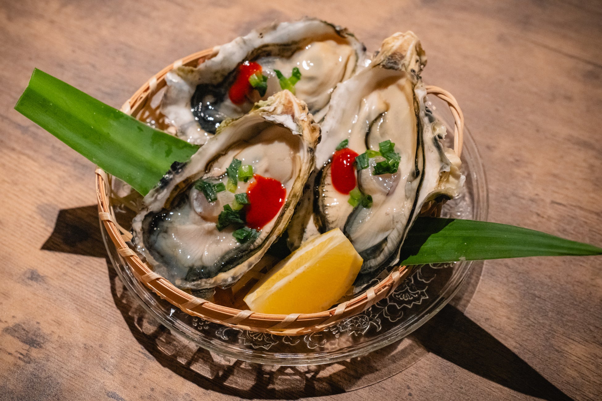 牡蠣は広島県産の国産牡蠣を使用し、熱々の焼き牡蠣をポン酢、醤油などの他多数の調味料と一緒に提供いたします。