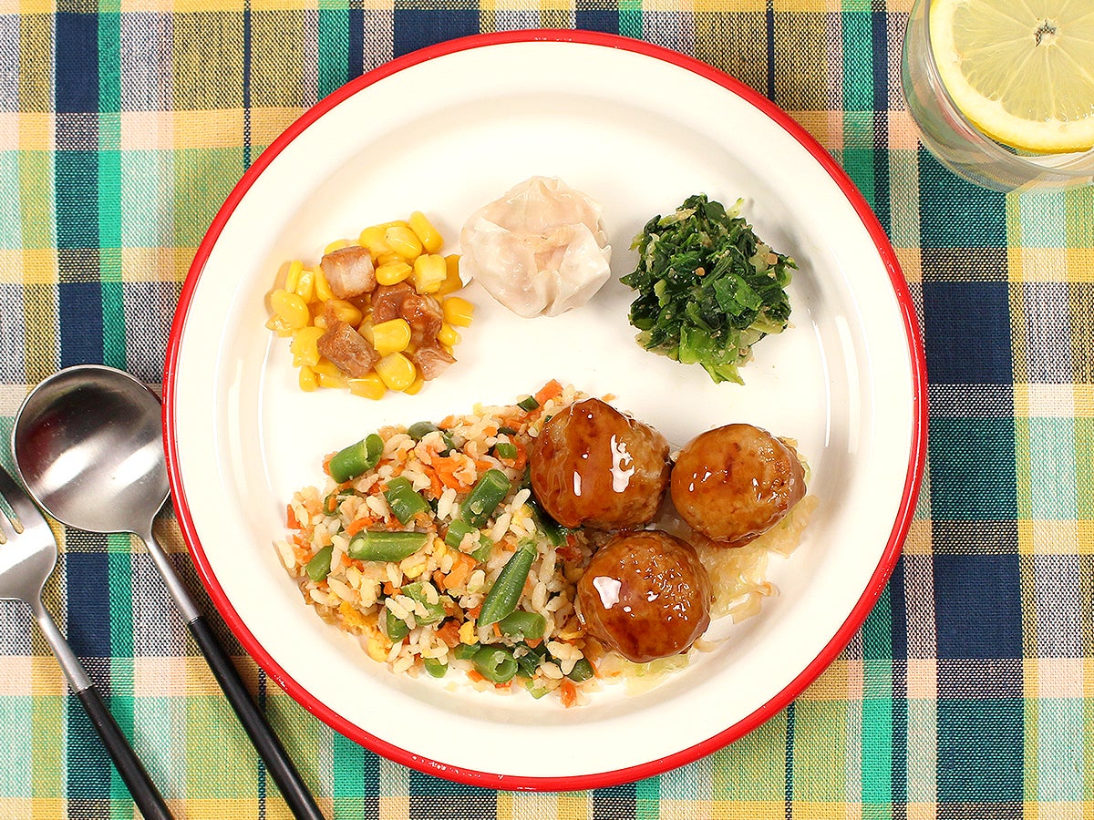 甘酢肉団子と炒飯のW主役でボリューム満点でありながら、炒飯には6種の野菜を混ぜ込み、野菜も一緒に食べられるように工夫をしております。副菜は、焼豚コーン、海鮮焼売、香りも栄養価もプラス!すりごま入りの青梗菜のごまだれです。