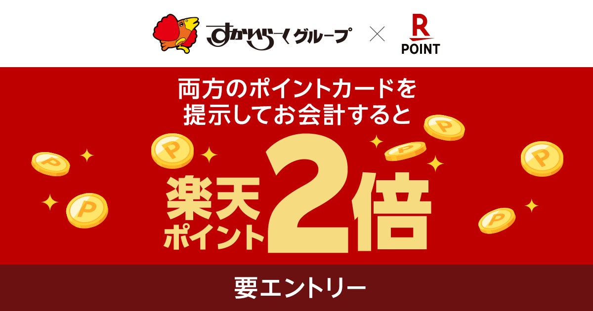 キャンペーン期間中にエントリーのうえ、すかいらーくグループの対象店舗で「楽天ポイントカード」もしくは「楽天ポイントカード」機能が搭載されたアプリ、または「楽天カード」裏面のバーコードと「すかいらーくアプリ」のポイントバーコードを両方提示して200円(税込)以上の会計をした方に、「楽天ポイント」を通常の2倍進呈します。さらに「すかいらーくポイント」も通常の2倍進呈します。 |