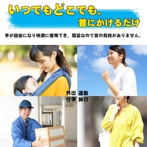 いつでもどこでも、首にかけるだけのタイプで、持つ必要がないので、手が自由になり快適に使用でき、軽量なので首の負担がありません。