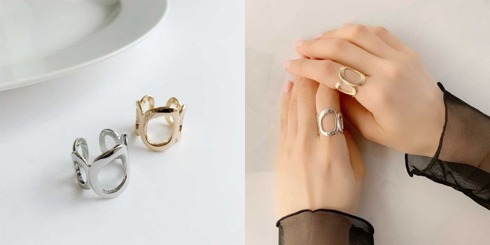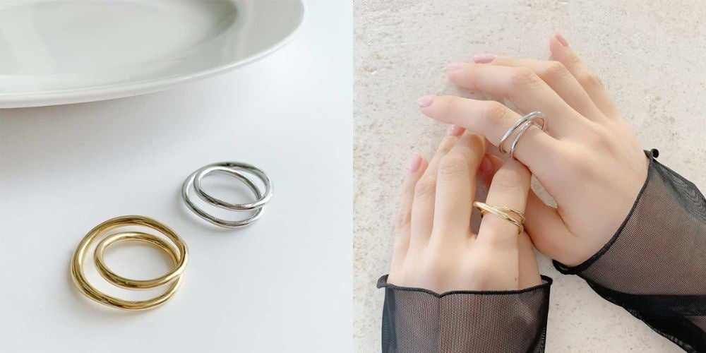 少しボリュームのあるリングは、どちらもモード感を感じさせるデザインに。