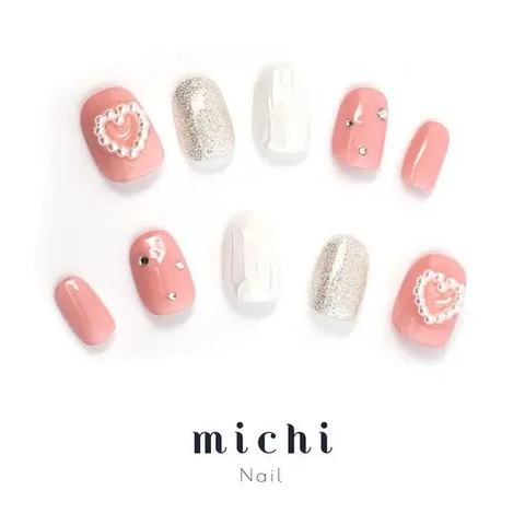 パールでできたハートが目を惹くキュートなネイルチップです。甘めのピンクとホワイト、ラメの組み合わせは王道の可愛さで、プレゼントに渡しても喜ばれそうな特別感があります。夏はもちろん、ライブなどラブリーなファッションをしたいときに年中楽しめるネイルチップです。