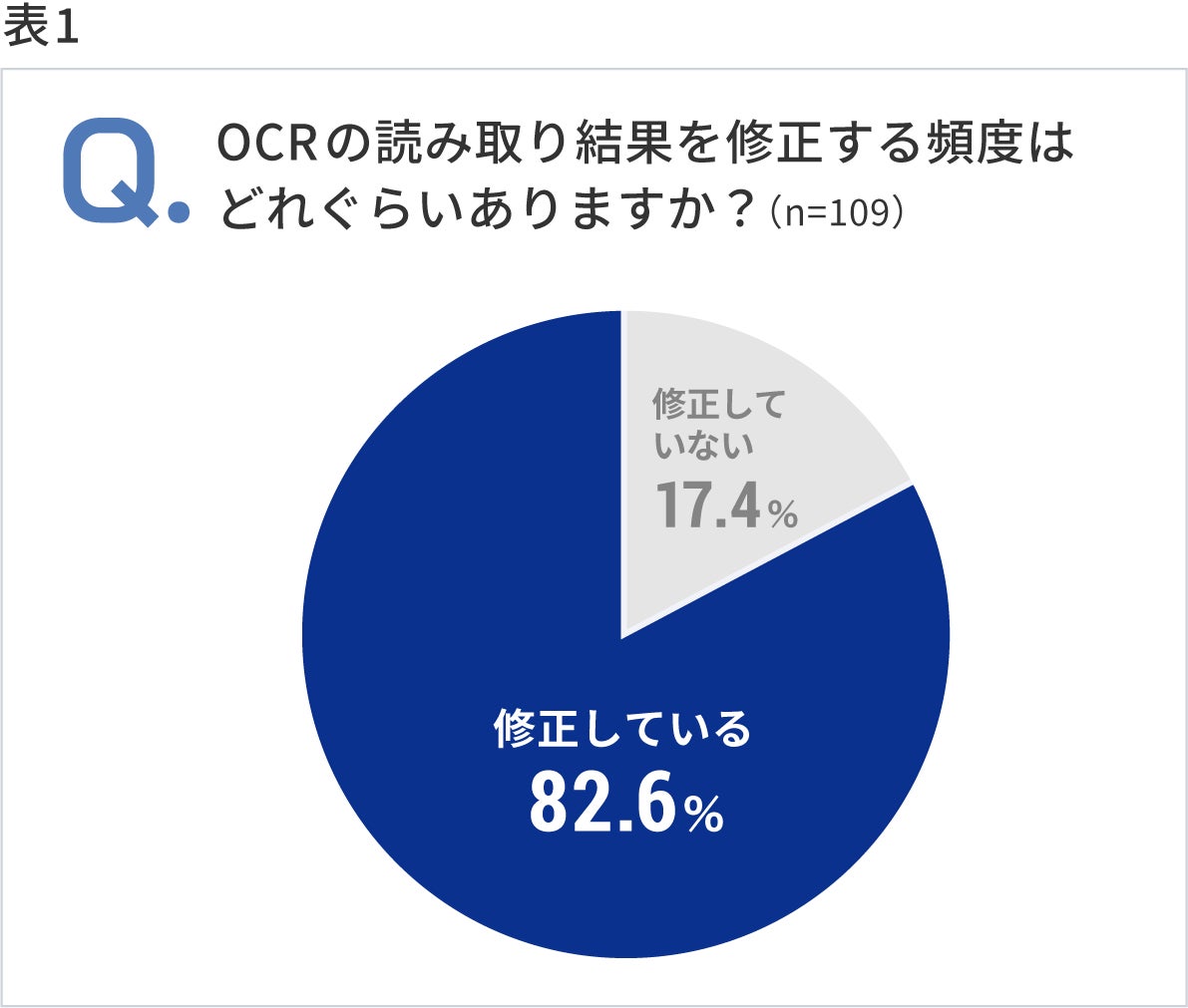 事務業務の効率化を目的にAI-OCRの導入が進む一方で、非定型書類における読み取り精度には依然として課題が残っており、その結果、OCR処理後のデータに対して利用者の8割以上が何らかの手修正を行っているのが実態です(表1参照)。