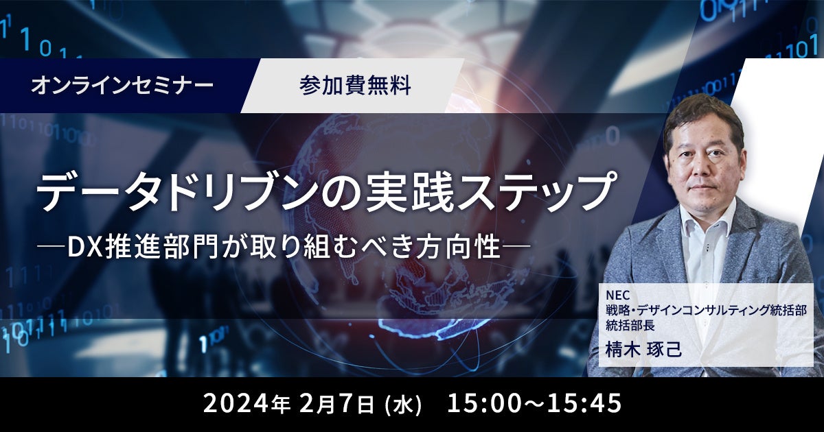 NECは、2024年2月7日にオンラインセミナー「データドリブンの実践ステップ─DX推進部門が取り組むべき方向性─」を開催します。