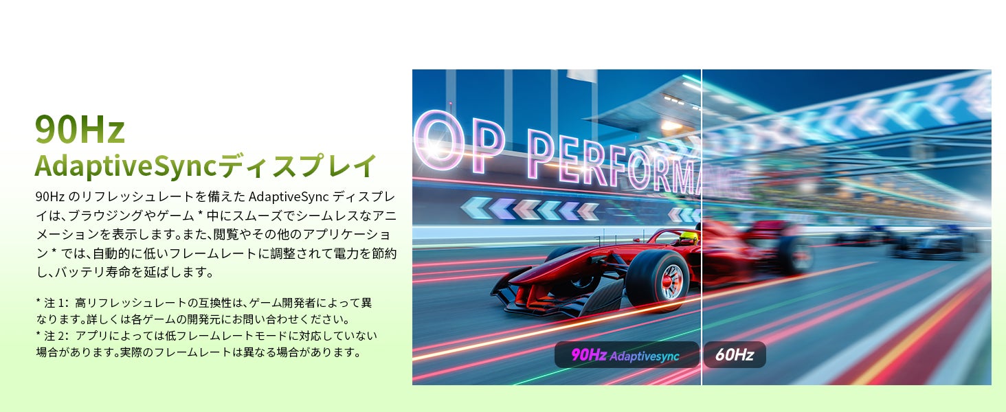90Hzのリフレッシュレートを備えたAdaptiveSyncディスプレイは、ブラウジングやゲーム中にスムーズでシームレスなアニメーションを表示します。また、閲覧やその他のアプリケーションでは、自動的に低いフレームレートに調整されて電力を節約し、バッテリ寿命を延ばします。