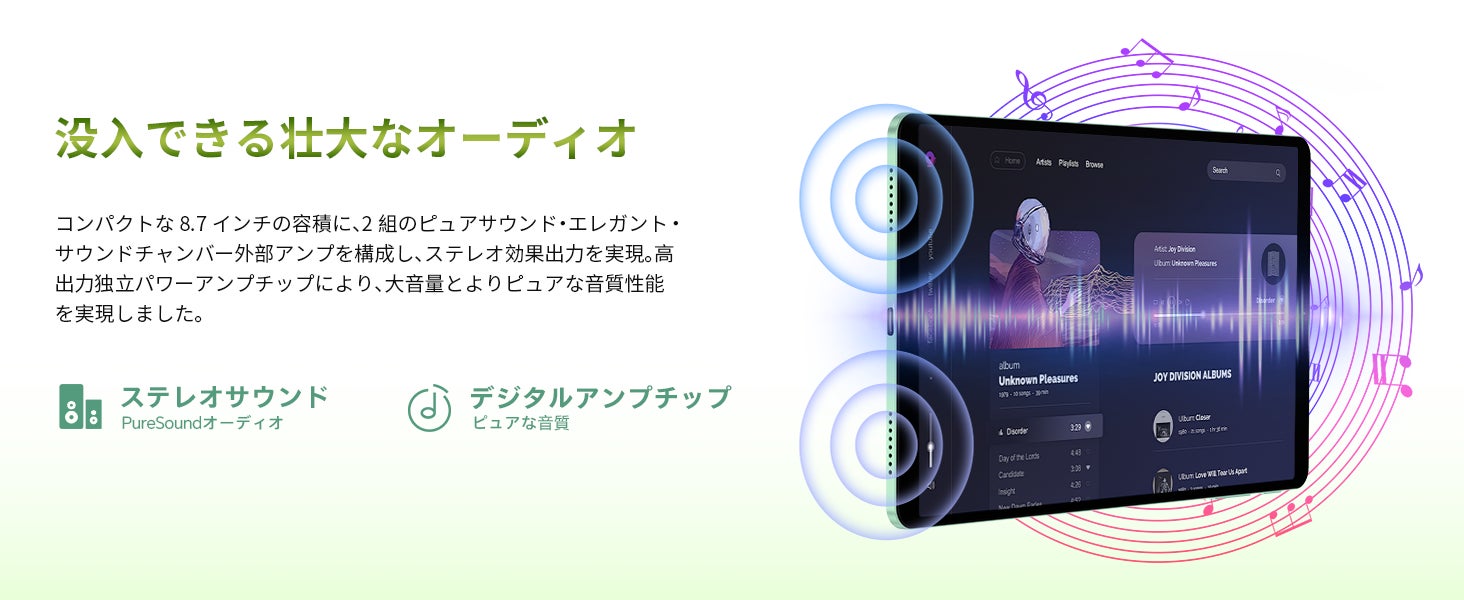 耐久性のある金属で作られたこの8.7インチのデバイスは、スリムなベゼルとわずか320gの軽量さを特長としています。高品質のメタルサンドブラスト仕上げにより、あらゆる角度から見える鮮やかな色の変化を体験できます。