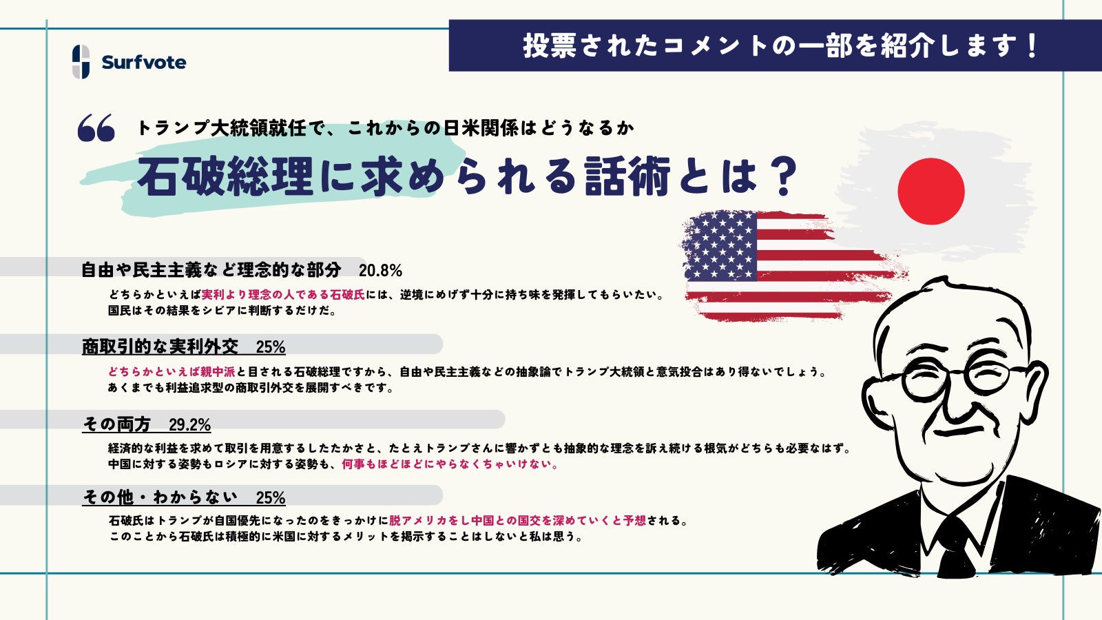 国際政治学者の和田大樹氏がSurfvoteでみんなの意見を募集。【商取引的な実利外交】を選択した人は回答者の25%だった。「石破総理は日本国民の心も掴めていないのでは」との意見も。