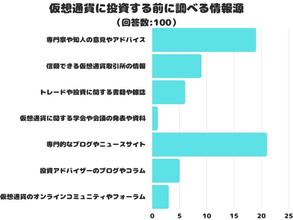2位以降は、「専門的なブログやニュースサイト」、「専門家や知人の意見やアドバイス」と続き、「仮想通貨に関する学会や会議の発表や資料」は8位という結果になりました。
