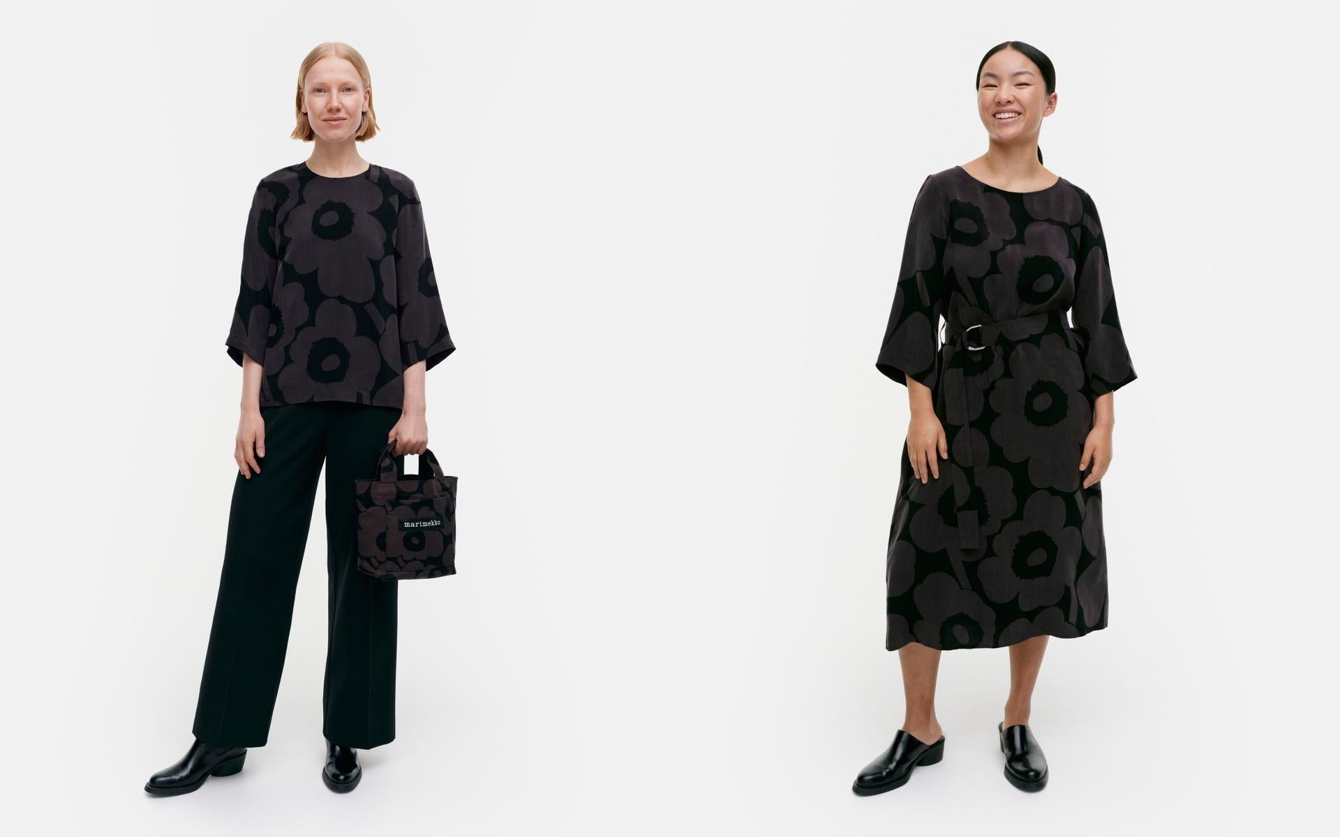 今回のコレクションでは、60周年を迎えたフラワープリント ウニッコを多彩に表現した新作ウェアが登場。アイコニックなブラックドレスには、ウニッコのフラワーモチーフが一枚一枚、立体的にあしらわれています。このドレスは、ウニッコのキャッチーなデザインと光沢感のある上品な素材が特徴で、シーンを選ばず、様々なスタイルに合わせやすいアイテムとなっています。
