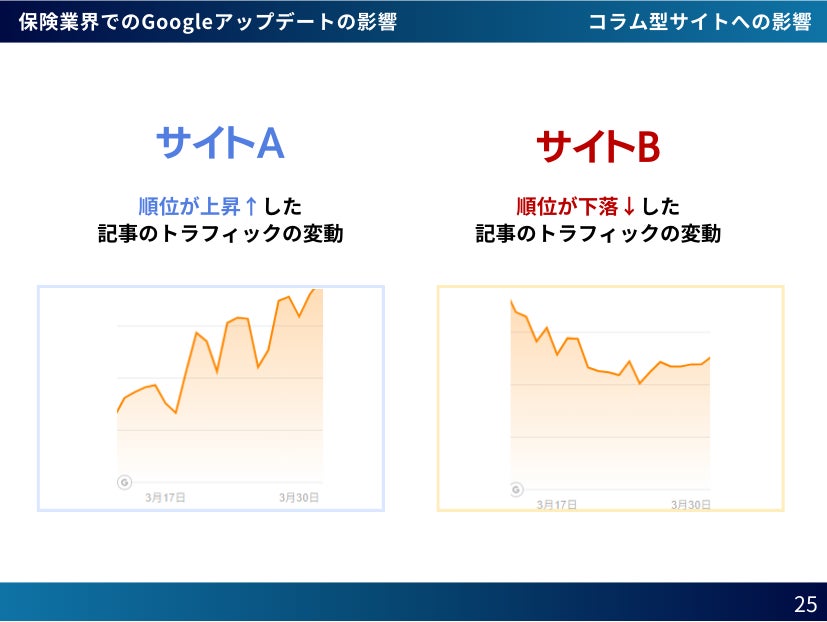 アップデート前後でトラフィックの変動があったサイトをコラム型サイト・データベース型サイトそれぞれで比較し、実際の影響を分析しています。