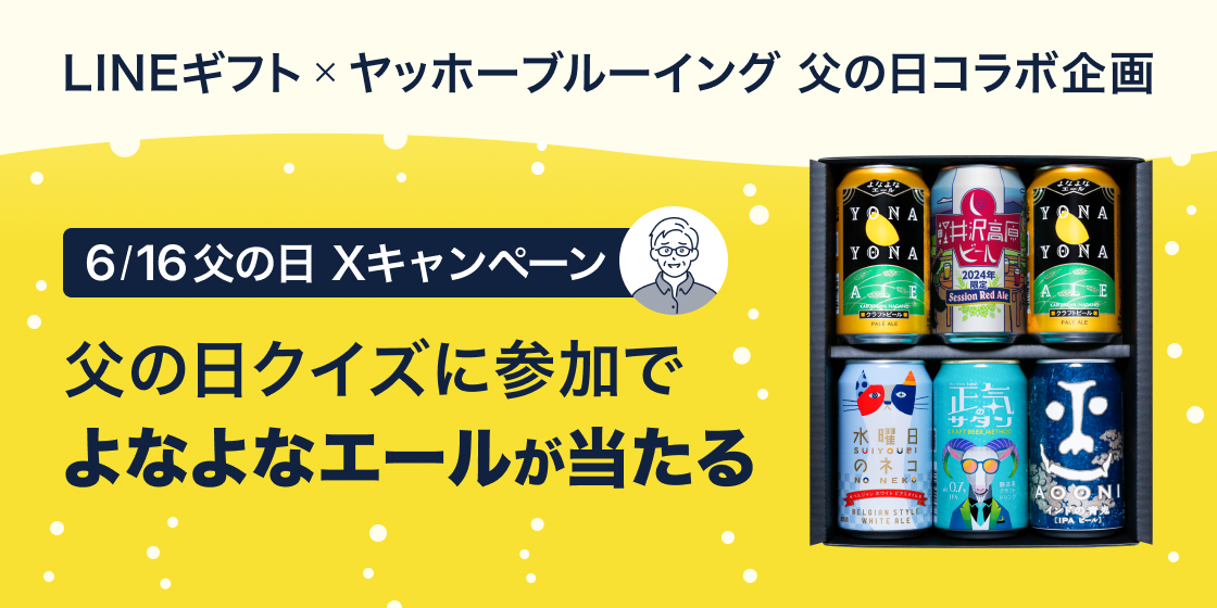 例年父の日に大人気のビール商品ですが、「LINEギフト」では昨年に引き続き、クラフトビール「よなよなエール」などを製造しているヤッホーブルーイングとのコラボキャンペーンを6月7日(金)より実施します。