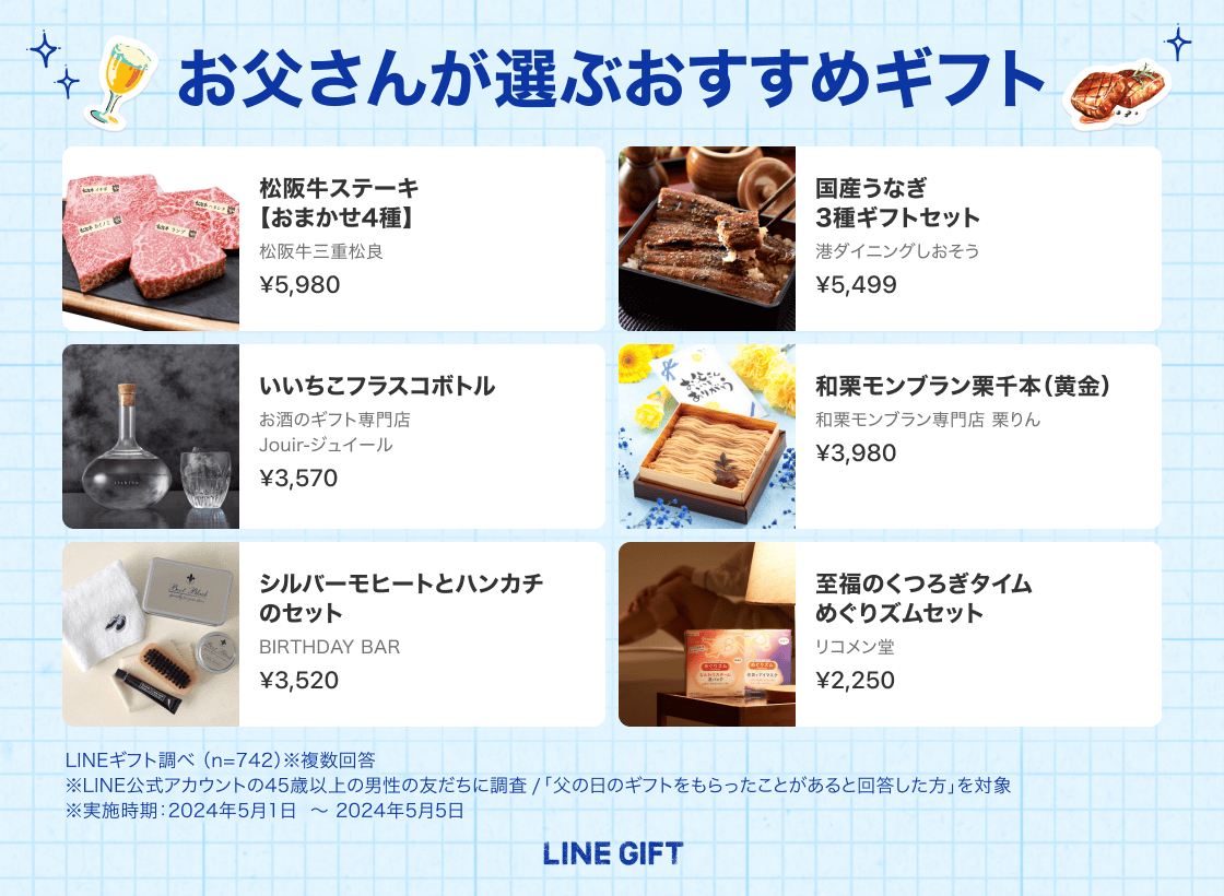 ※4 LINEギフト調べ (n=742)※複数回答 ※LINE公式アカウントの45歳以上の男性の友だちに調査 /「父の日のギフトをもらったことがあると回答した方」を対象 ※実施時期:2024年5月1日 〜2024年5月5日