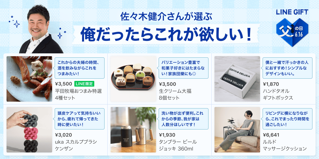 【LINEギフト】2024年の「父の日特集」を公開!ギフト選びに悩む方必見、昨年の人気カテゴリーやお父さんタレント・佐々木健介さんが選ぶ父の日ギフトを紹介