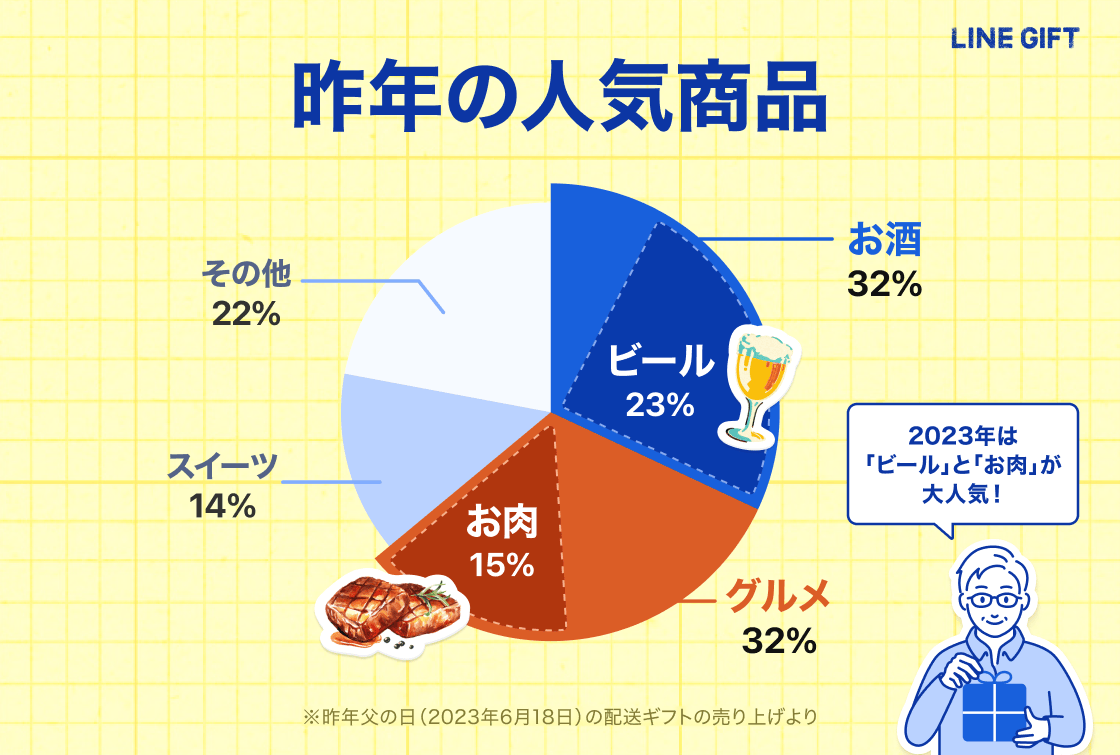 昨年の父の日における「LINEギフト」の人気カテゴリー(※3)をご紹介します。「お酒」「グルメ」ともに32%と同率となり、次いで「スイーツ」が14%という結果になりました。中でも「ビール」と「お肉」は非常に人気が高く、今年も人気の商品になることが予想されます。