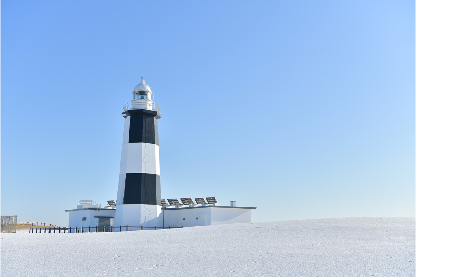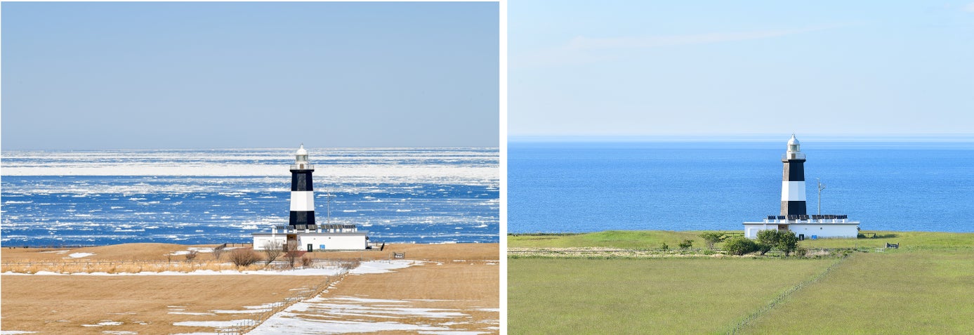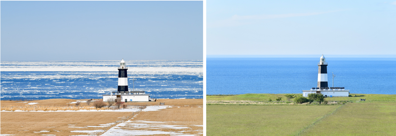 オホーツク海に面した能取岬からは知床連山を見渡すことができ、夏季の沖合にはクジラやイルカが回遊し、冬季には流氷が訪れます。このような素敵な岬の先端に能取岬灯台があり、映画やCMのロケ地としても数多く利用されている魅力的な観光地となっています。