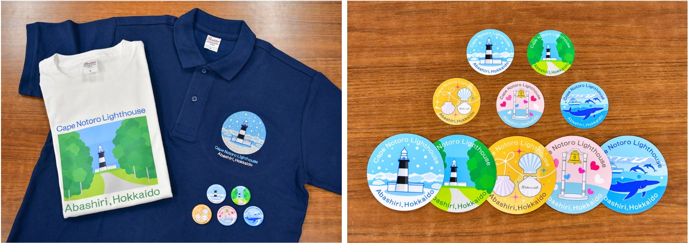 灯台(夏・冬)、願いを叶える鐘、ホタテ貝の絵馬、クジラをモチーフとしたイラストのデザインとグッズ(ステッカー小、大、缶バッジ、Tシャツ、ポロシャツ)の制作・販売を行ないました。イラストは札幌市在住のももいじゅん様に依頼し、素敵なデザインに仕上がりました。グッズは「道の駅流氷街道網走観光案内所」と「JR網走駅観光案内所」にて販売中で、旅行者の思い出の品になるとともに、売店での灯台プロモーションも兼ね、灯台と売店とで相乗効果を生みます。