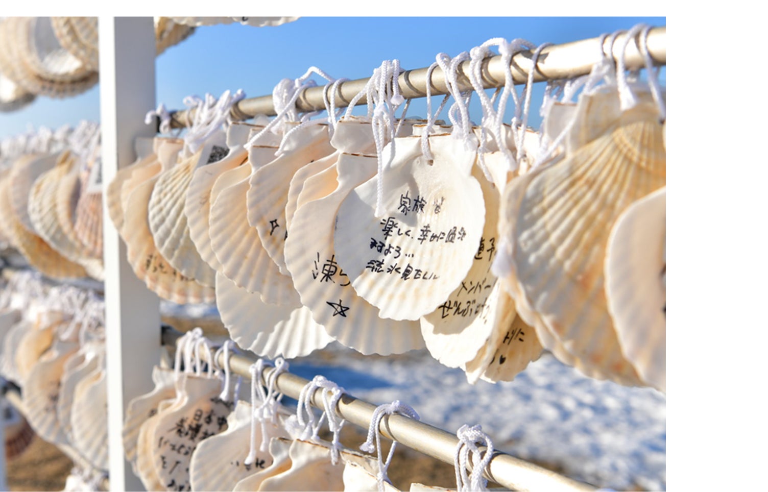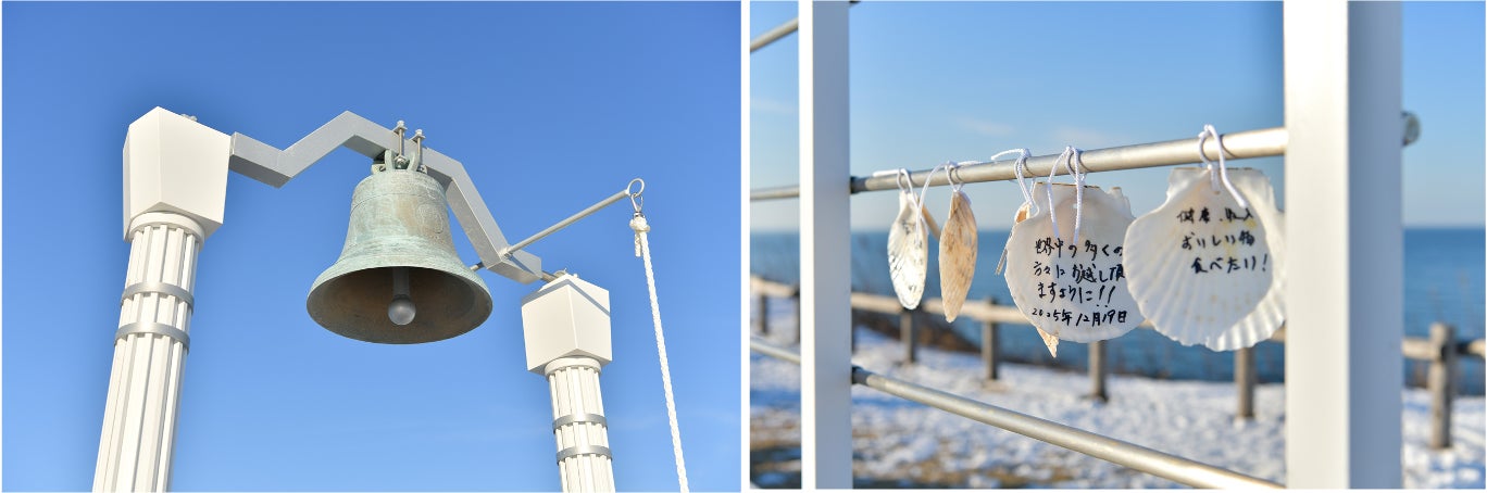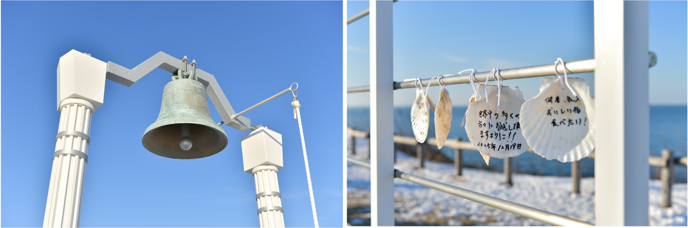 訪れた方は、「ホタテの貝の絵馬」に願い事を書き、「願いを叶える鐘」を鳴らします。灯台の光が願いを空へと運び、叶えてくれる。そんな特別な体験をお届けします。