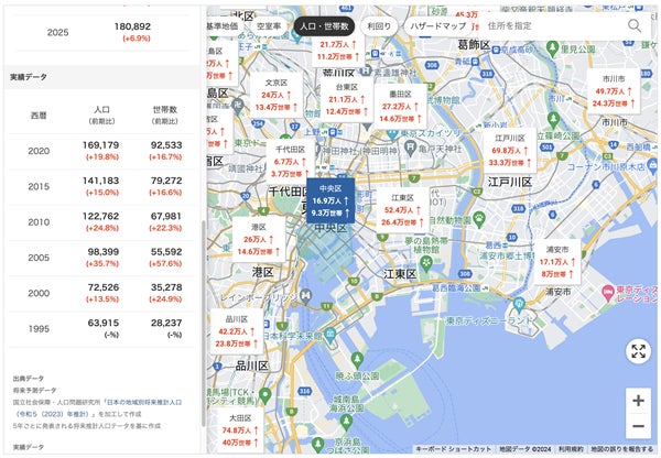 「人口・世帯数」や「洪水ハザードマップ」など投資判断に必要な7つの項目を、地図上で一括チェックできる「賃貸経営マップ」に、初めて「人口の将来予測データ」が追加されます。