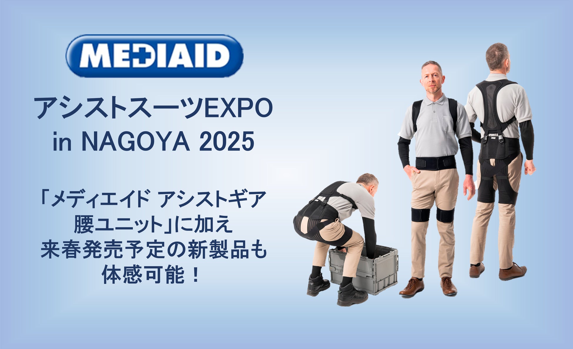 日本生まれのサポーター専業ブランド「MEDIAID(メディエイド)」を展開する、日本シグマックス株式会社(本社:東京都新宿区、代表取締役社長:鈴木洋輔)は、2025年1月29日(水)、30日(木)に開催される、アシストスーツ体験展示会「アシストスーツ EXPO in NAGOYA 2025」に出展。アシストスーツ「メディエイド アシストギア 腰ユニット」および来春発売予定の新製品を試着・体験いただけます。