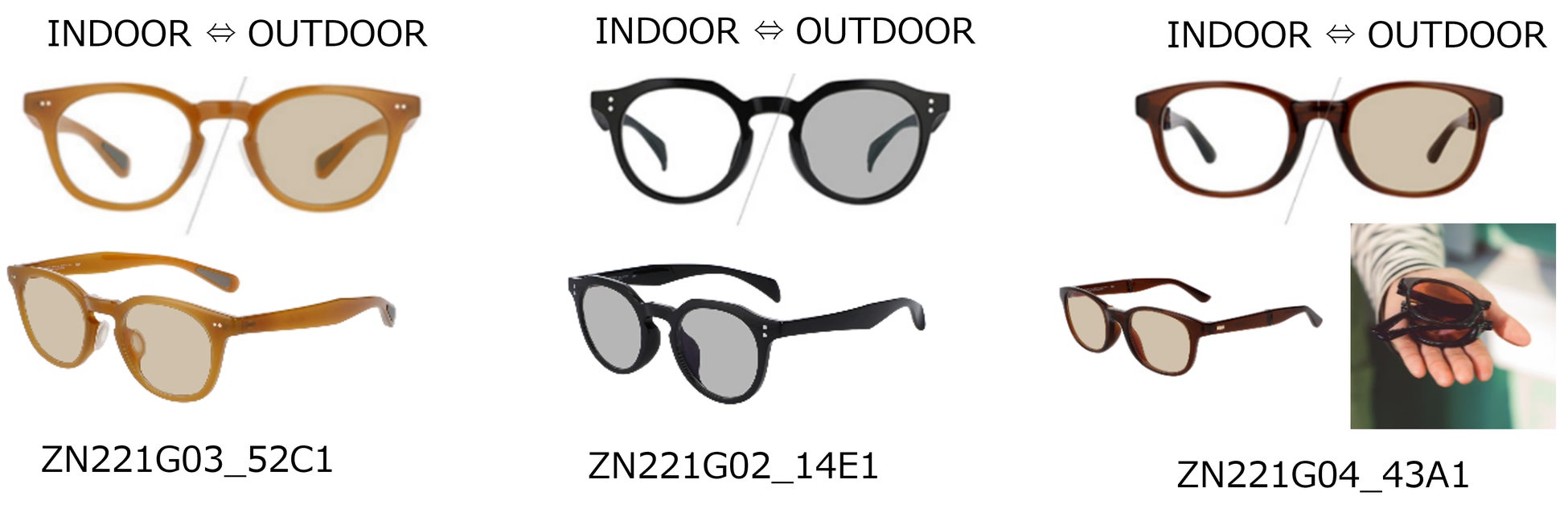 外遊びを楽しむプロのYURIEさんと考えた、紫外線により色が変わる調光サングラス。紫外線の量により、レンズの色の濃度が変化する2Wayレンズ。夜間や屋内、テントの中など紫外線が当たらない場所だとメガネ、日の出ている屋外でサングラスとして1本で2通りの活躍をします。まぶしさをカットしながらも景色を楽しみたい、ちょっとした山歩きなどにもおすすめです。紫外線量に反応して色が変わるので、メガネとサングラスをかけかえる必要が無く、荷物が減るのも嬉しいポイントです。