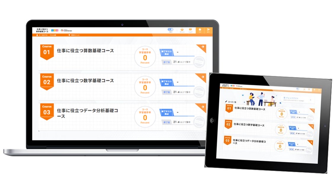 「仕事に役立つ数学基礎コース」は、デジタル情報量の爆発的増加を背景に数値情報の分析、活用ができる人材育成のニーズの高まりを受け、株式会社すららネットと公益財団法人日本数学検定協会が共同で開発した、数学基礎を学び数学的思考の土台を固め、仕事に役立つスキルを身に着けるICT教材です。
