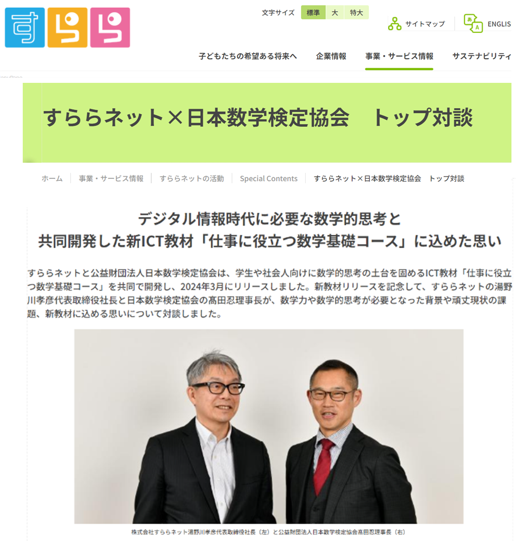 すららネットと日本数学検定協会のトップ対談をすららネットコーポレートサイトで公開