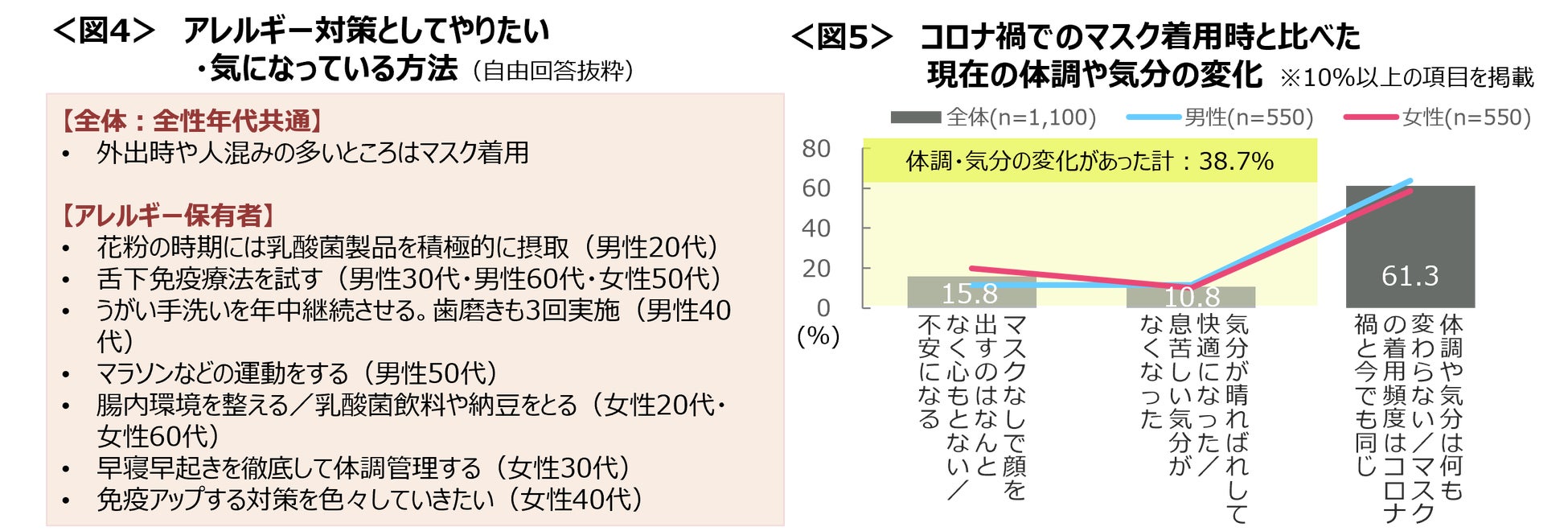 コロナ禍でマスクを着用していた時と比べ、「マスクなしで顔を出すのはなんとなく心もとない/不安になる」「気分が晴ればれして快適になった/息苦しい気分がなくなった」など、気分の変化があった人は4割。 <図5>