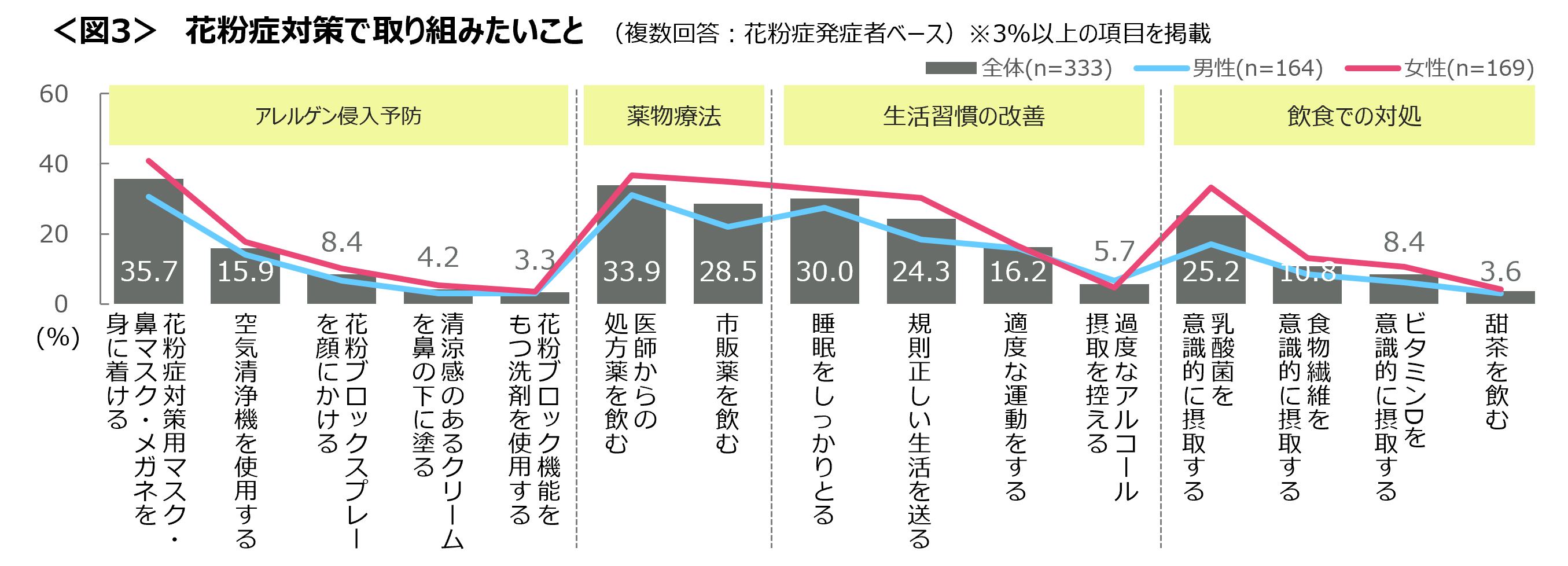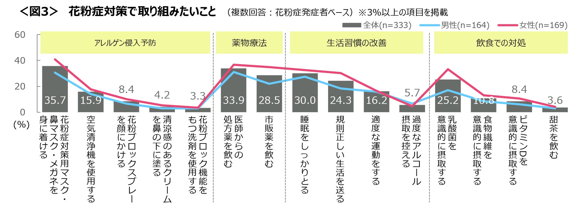 男性よりも女性の方が多岐に渡る対策を講じている様子がうかがえる。<図3>