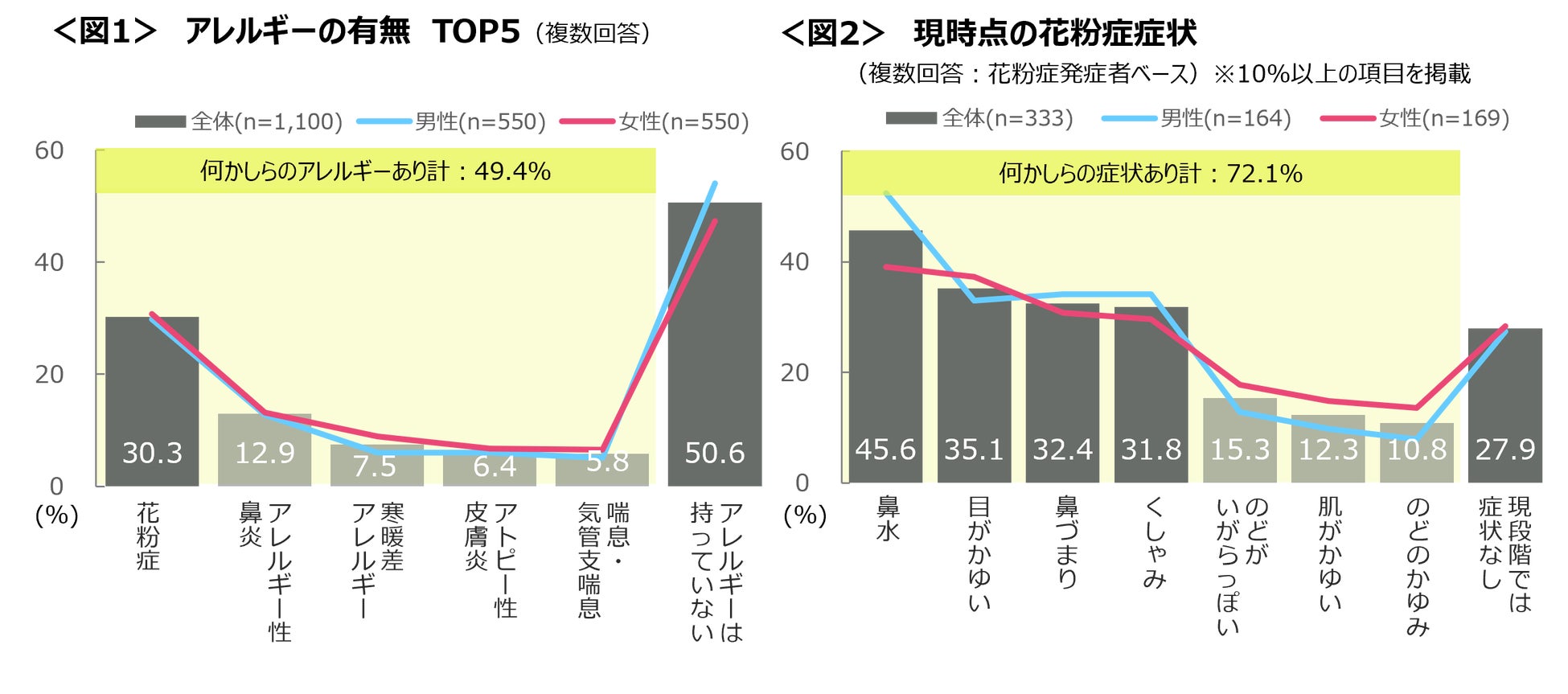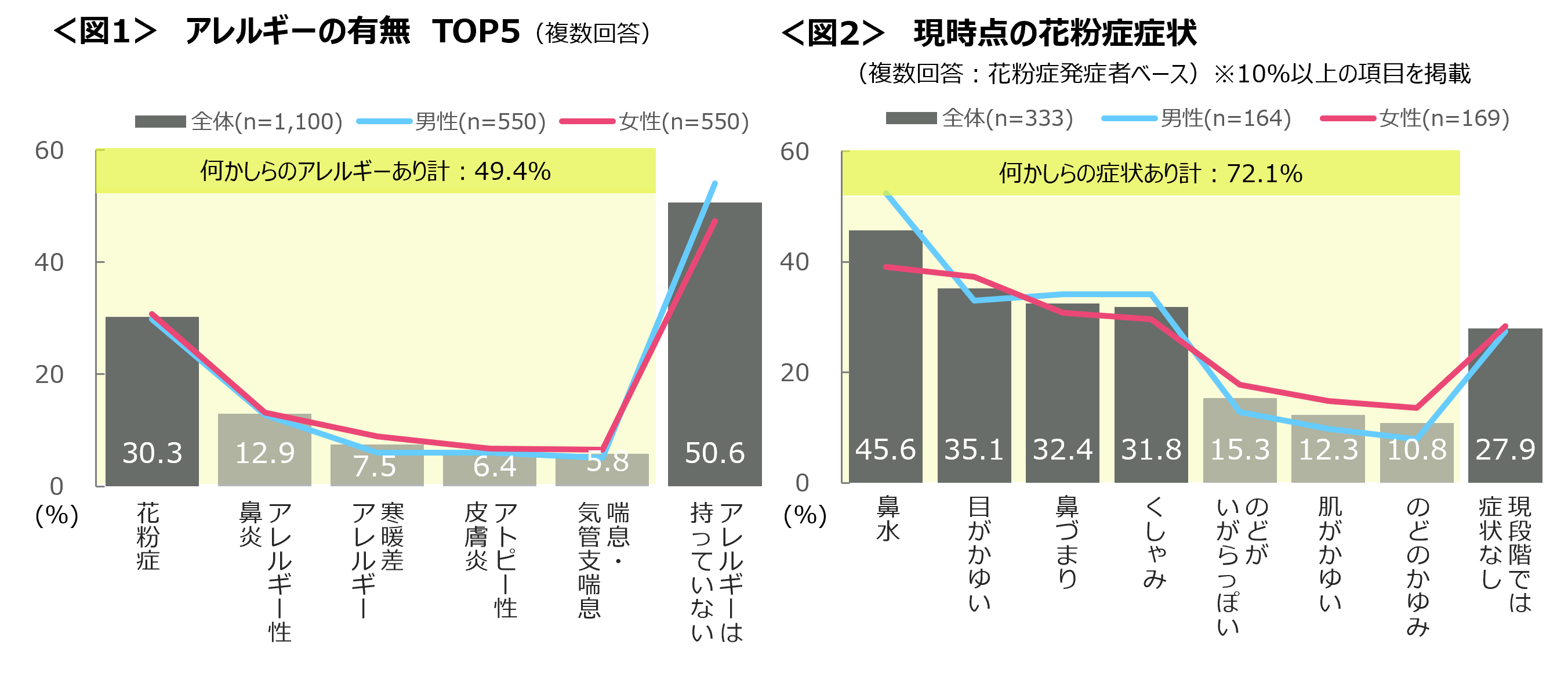 何かしらのアレルギーを持っている人は5割。特に、「花粉症」をあげた人は男女共に3割と最も多い。<図1>