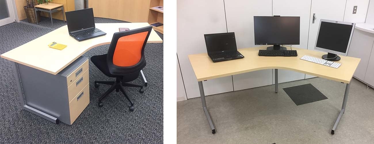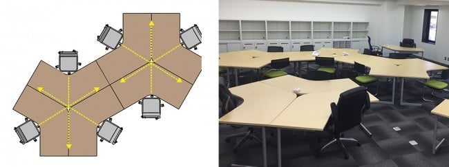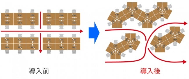 平机の場合、正面のスタッフと視線が合いやすく、モニターやデスクトップパネル、ラックなどで仕切りを作る必要がありました。しかし、120度の角度がついたL字型デスクでは、互いの視線が合わないため仕切りは必要ありません。
