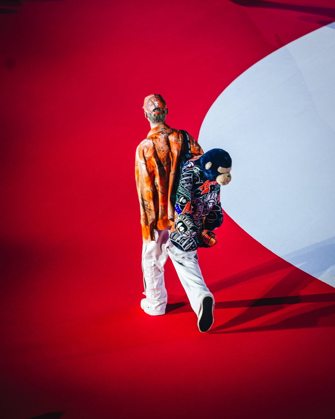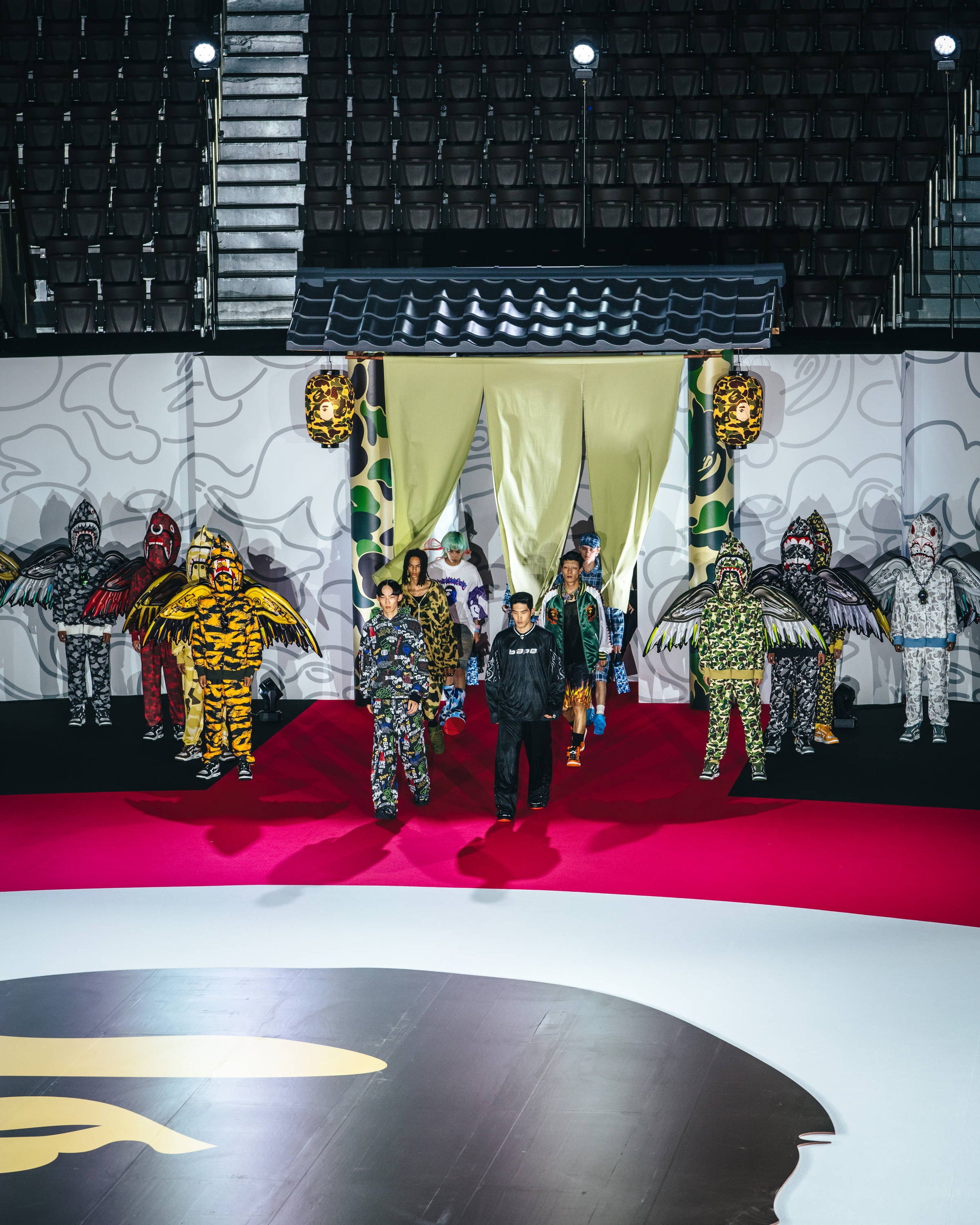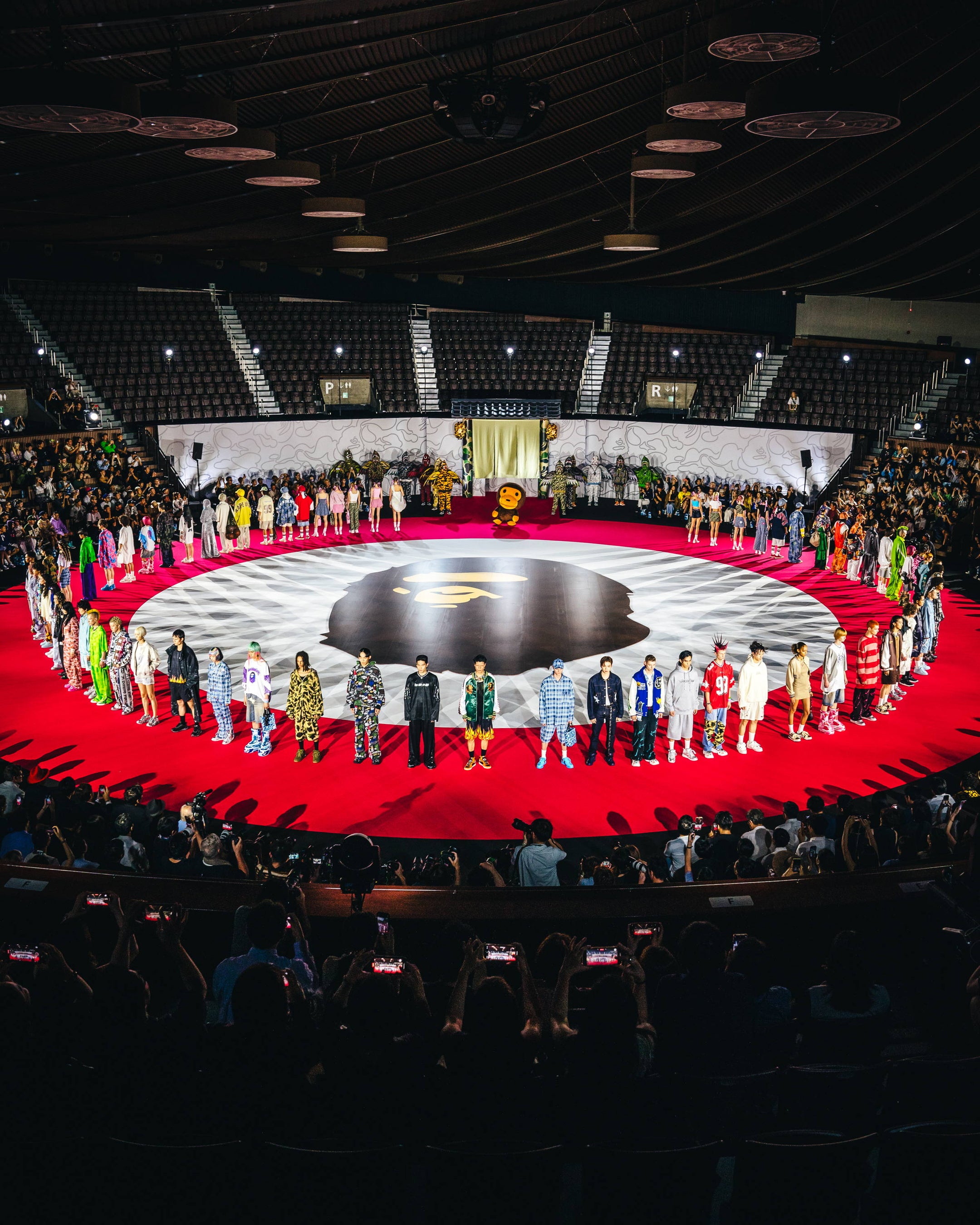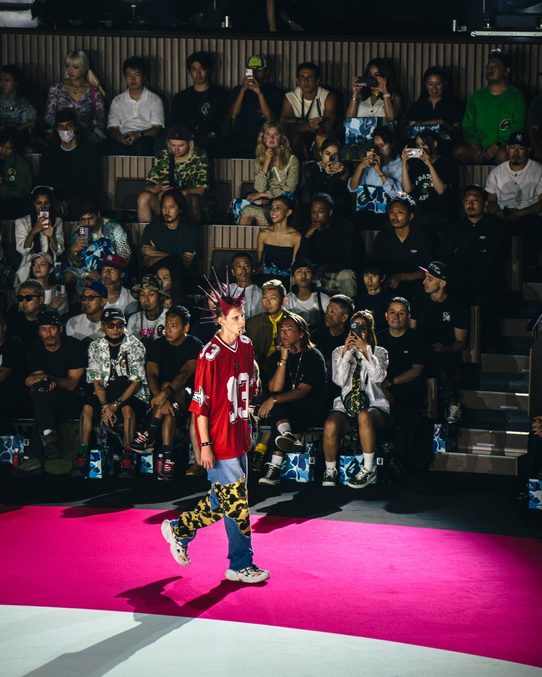 舞台は創業の地、東京・原宿。ストリートブランドのパイオニアよるランウェイショーは、ひと際注目度が高く、“ベイプカモ(BAPE®︎ CAMO)”柄にライトアップされた会場の国立代々木競技場 第二体育館前には、人、人、人。