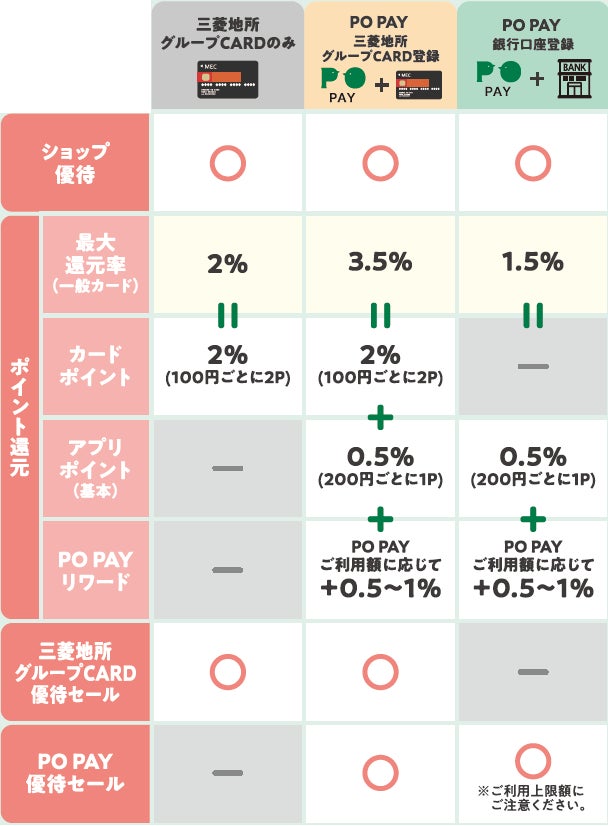 これにより「PO PAY」に三菱地所グループCARD(Visa)を登録した場合、同カードの三菱地所グループポイント(2%)と「PO PAYリワード」によるアプリポイント(最大1.5%)の合計最大3.5%のポイント還元を受けることができるものです。