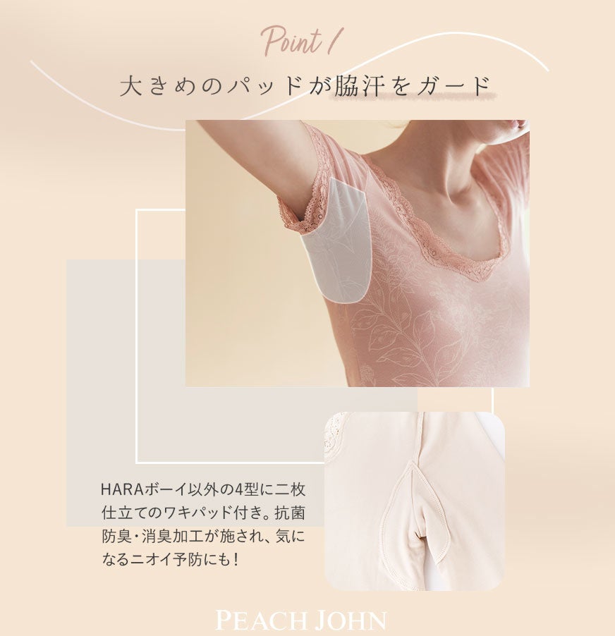 キャミソール、半袖や9 分袖、HARAマキ付きのボーイレッグやスリップタイプなどシーンに合わせて選ぶことができる全5種のラインナップ。毎年定番の機能付きインナーは汗ジミ予防としても着用できます。
