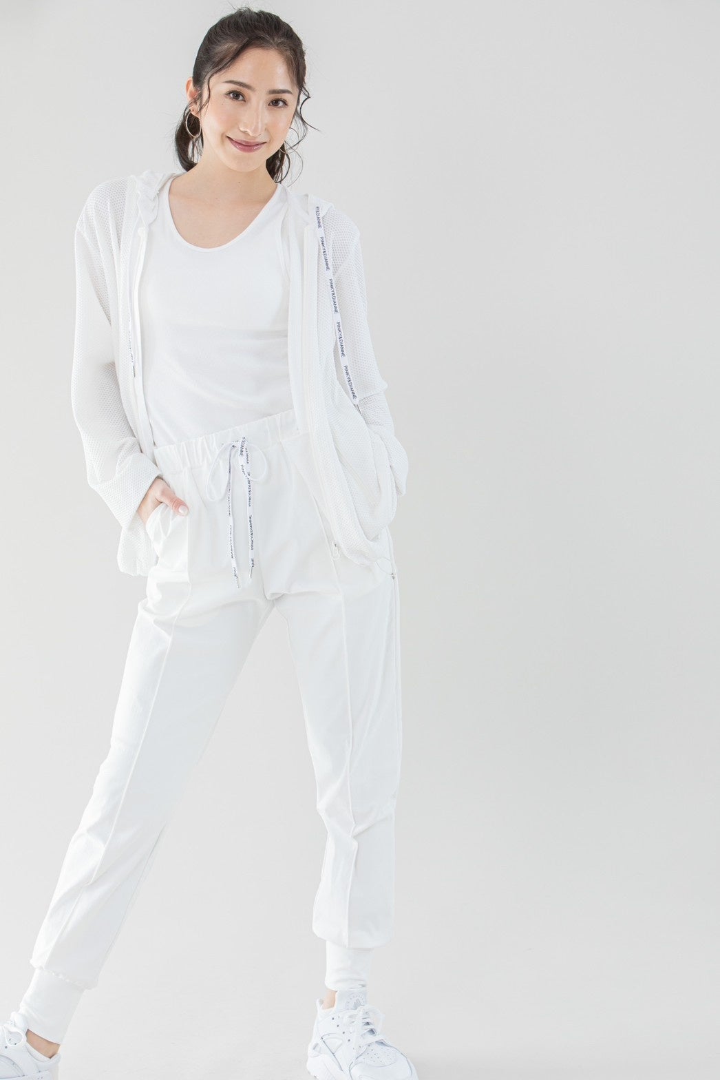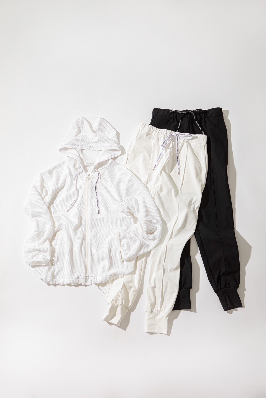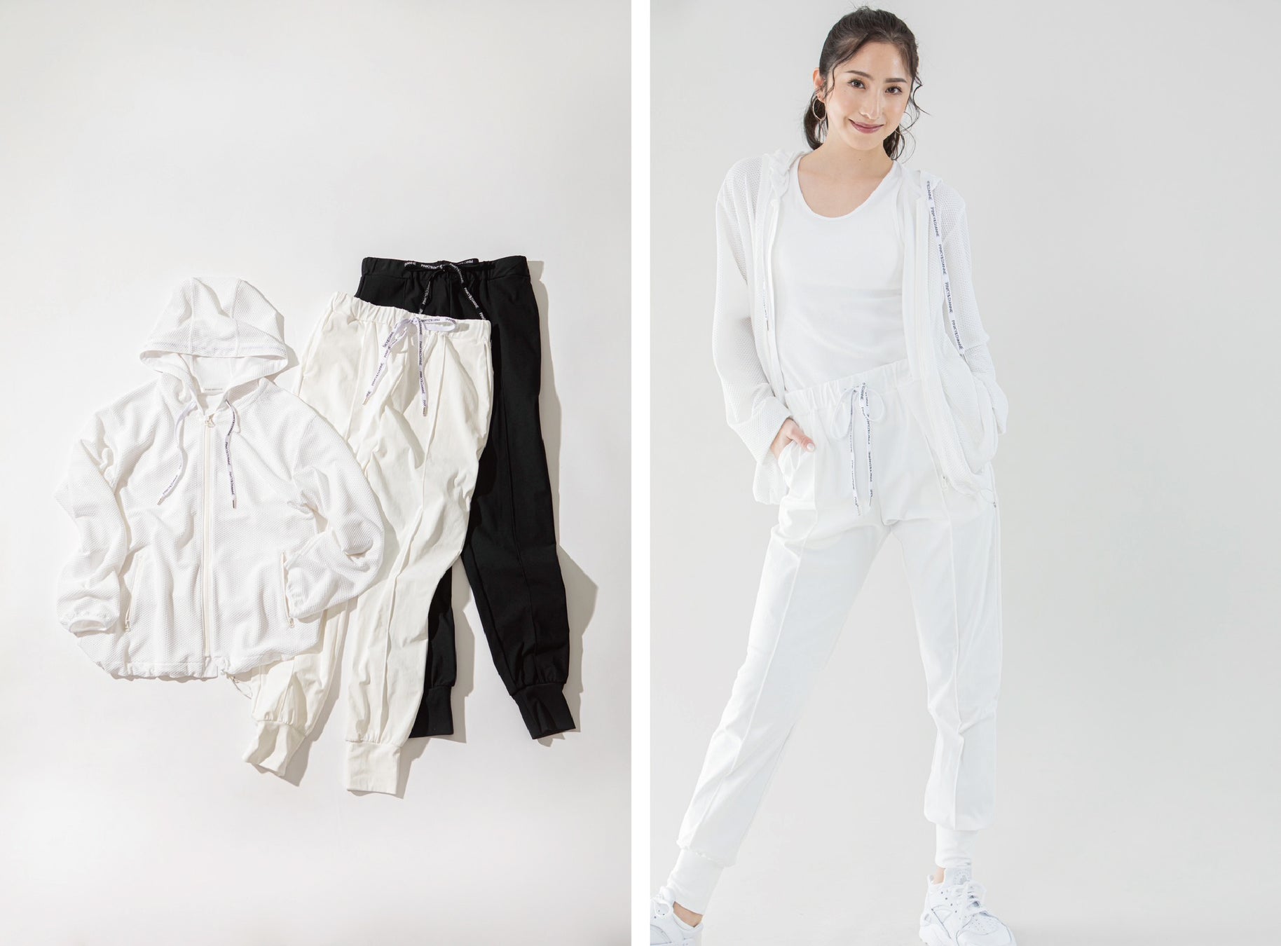 ジップアップメッシュフーディは裾のスピンドルを絞ることでシルエット変更も自由自在に。通気性に優れたメッシュ素材を使用することで蒸れにくく、着心地も軽やかにスポーツシーンでもストレスフリーな一枚。ジョガーパンツは薄手のジャージー素材を使い、高いストレッチ性と裾部分を少し長めにしていることで足首を細く、脚を長く美シルエットにみせてくれます。