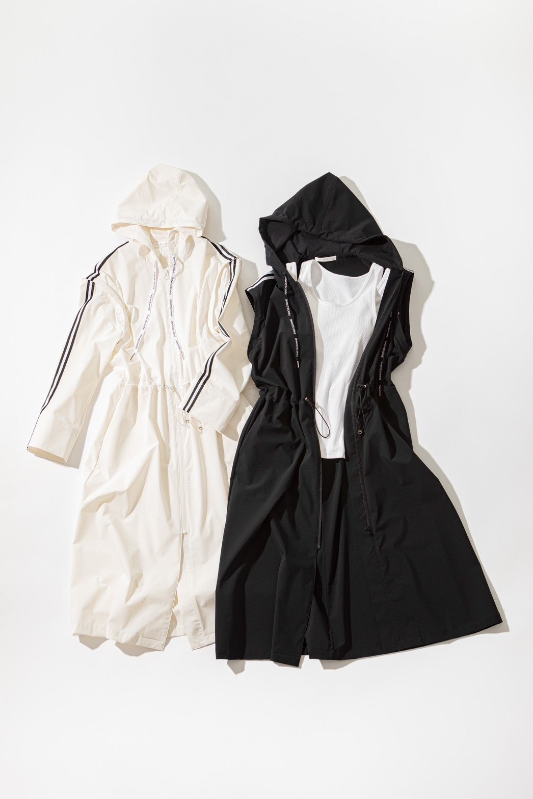アウトドアにも使用される撥水2WAY素材を、タウンでも着やすいデザインに落とし込んだロングパーカー。ウエストはゴムのドローストリング仕様なのでラフに絞ってワンピース風にも着用できます。スリーブはスナップで取り外し可能で、Tシャツなどとレイヤードしてジレ風の着こなしも楽しめます。カップ付きタンクトップは毛羽が少なく上品見えするリブ素材を使用。ショルダー部分は重ね着している様なレイヤードデザインになったトレンド感のある一枚。カジュアルになり過ぎず、着心地と見え方に徹底的にこだわったアイテムです。