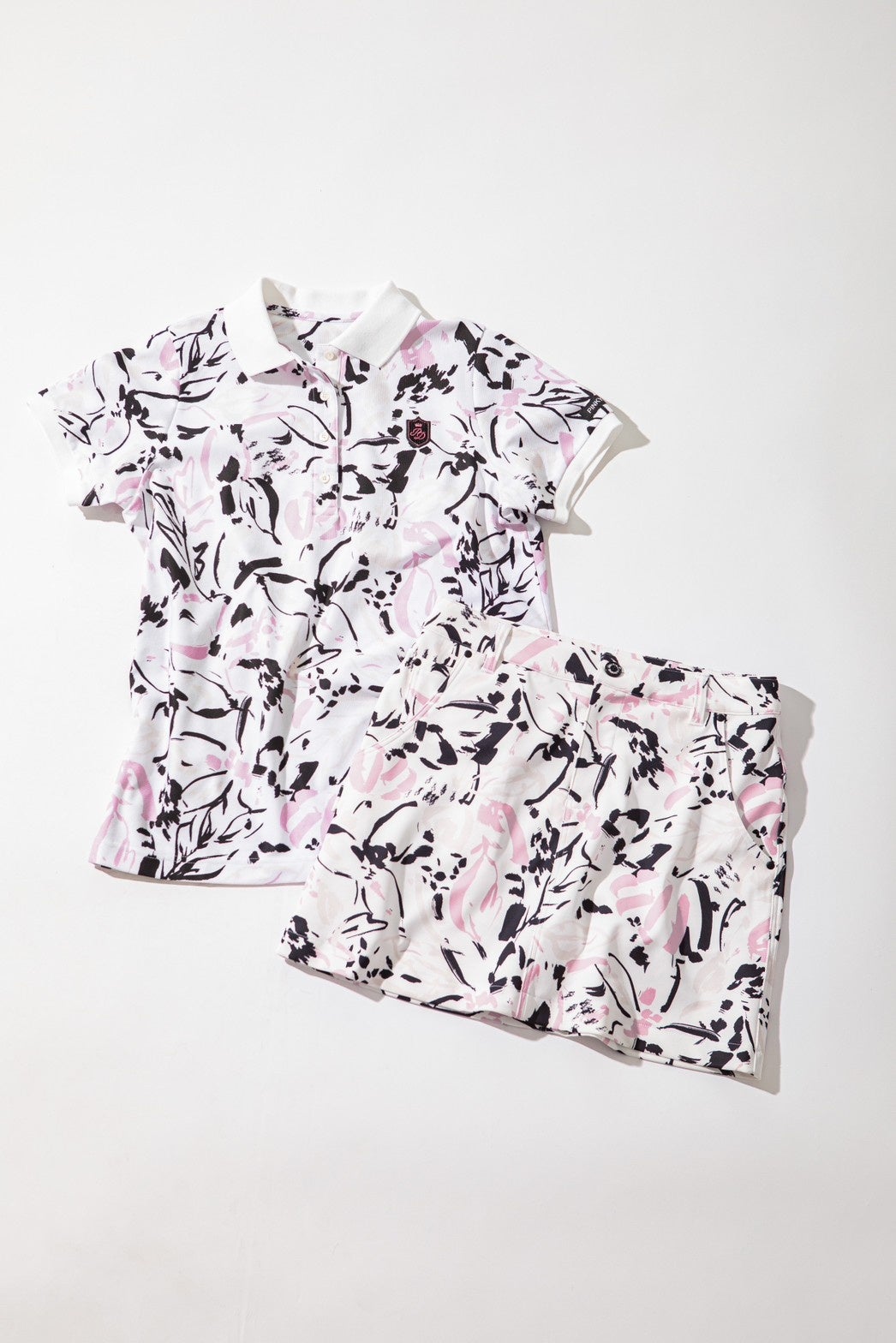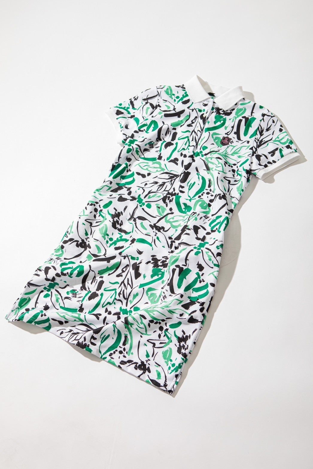 筆書きタッチのフラワープリントのポロワンピース。アクセントにブランドオリジナルのエンブレムワッペンや刺繍を施しデザイン性も高く、吸水速乾やUVカットと高機能にさらにストレッチも効いた快適なアイテム。
