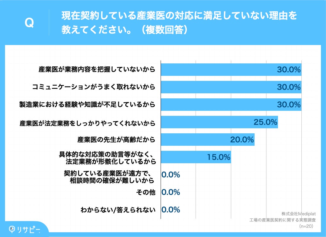 また、「満足していない(「あまり満足していない(改善余地あり)」「満足していない(改善余地が大きい)」)」と回答した方に、「満足していない理由」を調査したところ、「産業医が業務内容を把握していないから」「コミュニケーションがうまく取れないから」「製造業における経験や知識が不足しているから」がそれぞれ30.0%という結果となっています。